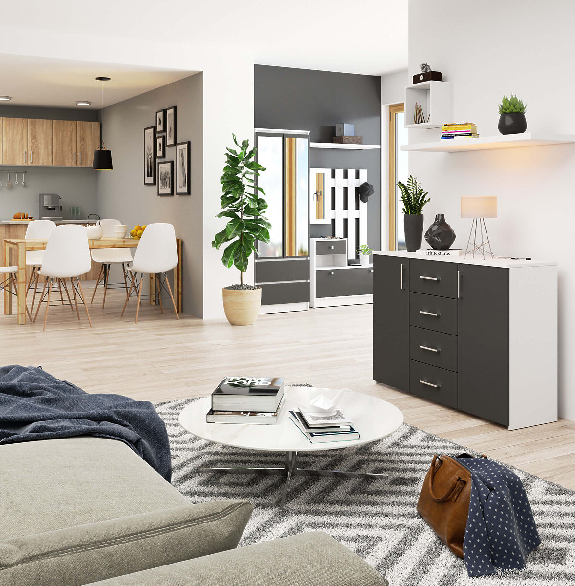 La commode, modèle K 45, est une excellente réponse aux besoins des utilisateurs actuels. Fabriquée en blanc mat avec un ajout de chêne artisan, elle incarne la nature et l'élégance. Cette solution originale offre aux utilisateurs un large champ pour l'aménagement, limité uniquement par l'imagination.