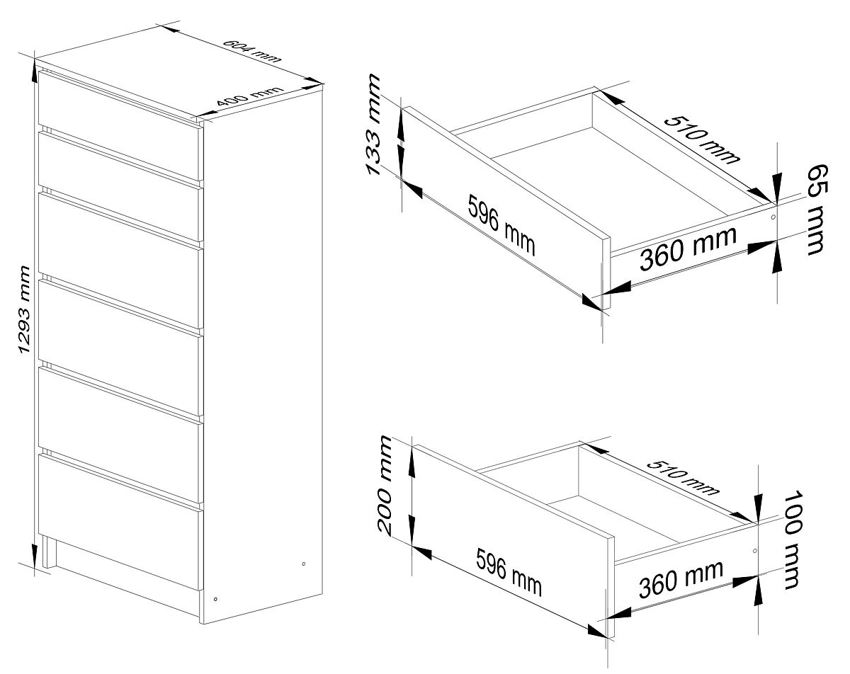 COMMODE K60 AVEC 6 TIROIRS Fabriquée en panneau stratifié de 16 mm résistant à l'usure.