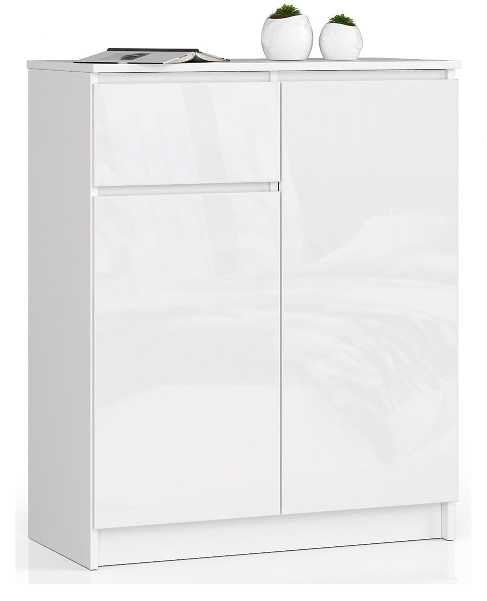 La petite commode blanche est équipée d'un tiroir pratique et de deux armoires fermées - chacune contenant deux étagères. Le meuble se distingue par une construction solide et une finition soignée. L'offre présentée ravira l'œil et répondra aux attentes même des clients les plus exigeants en termes de fonctionnalité. La commode K 80 cm est une combinaison d'un corps blanc avec des façades à haute brillance de la même couleur. Ce meuble élégant s'intègre sans aucun doute parfaitement dans de nombreux intérieurs aménagés dans un style scandinave, minimaliste ou moderne.