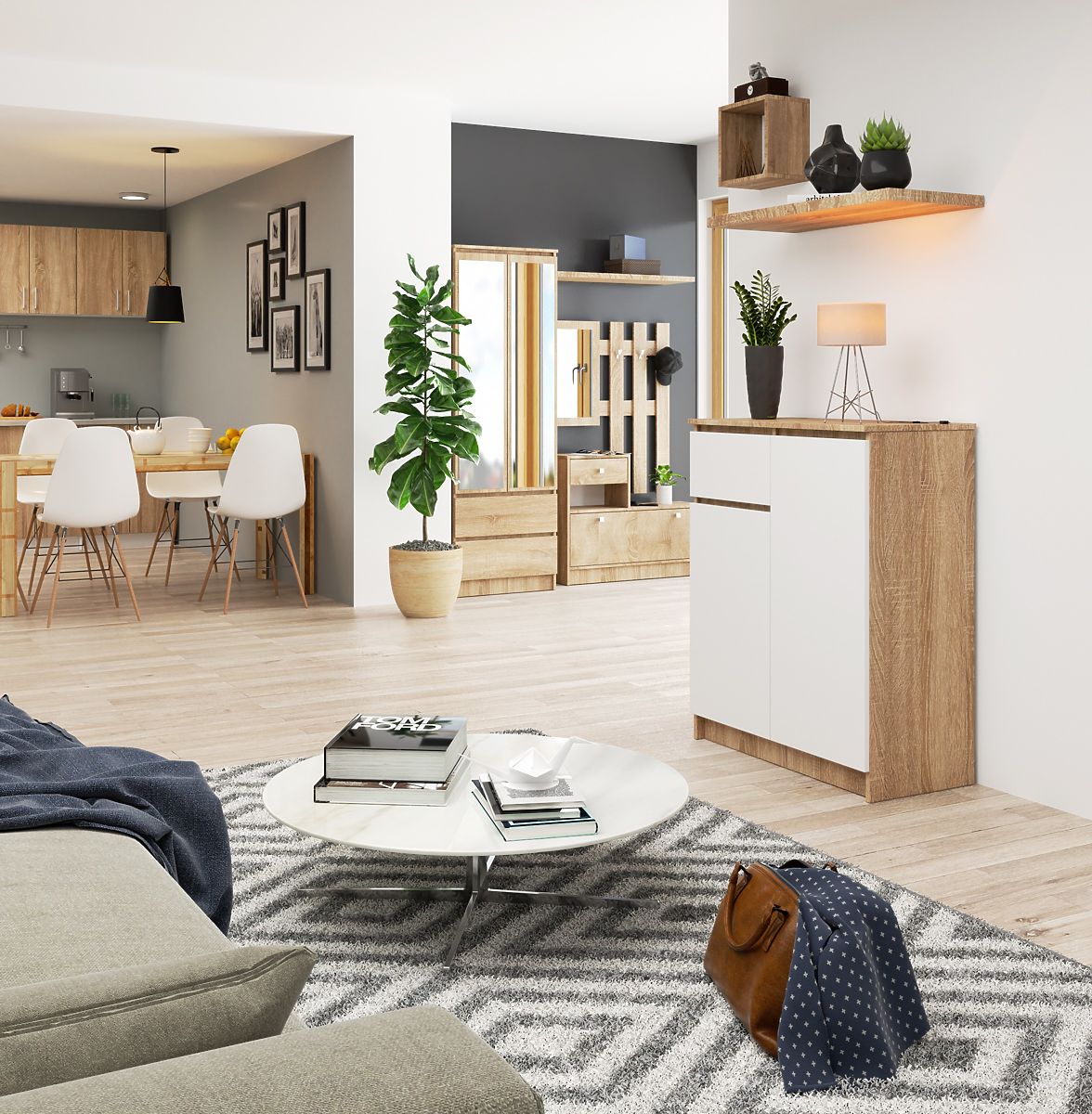 La petite commode est un élément d'ameublement qui trouvera sa place dans chaque pièce. Les couleurs claires, la construction solide et la finition soignée ont conduit à la création d'un meuble adapté par exemple à l'entrée, au salon ou à la chambre d'enfant, mais aussi à la chambre à coucher. Elle peut également être utilisée dans un bureau, où elle permettra de ranger de nombreux documents et autres fournitures de bureau. La commode se compose de deux armoires fermées (chacune avec deux étagères) et d'un tiroir. Le meuble combine des couleurs à la mode - blanc et chêne sonoma.