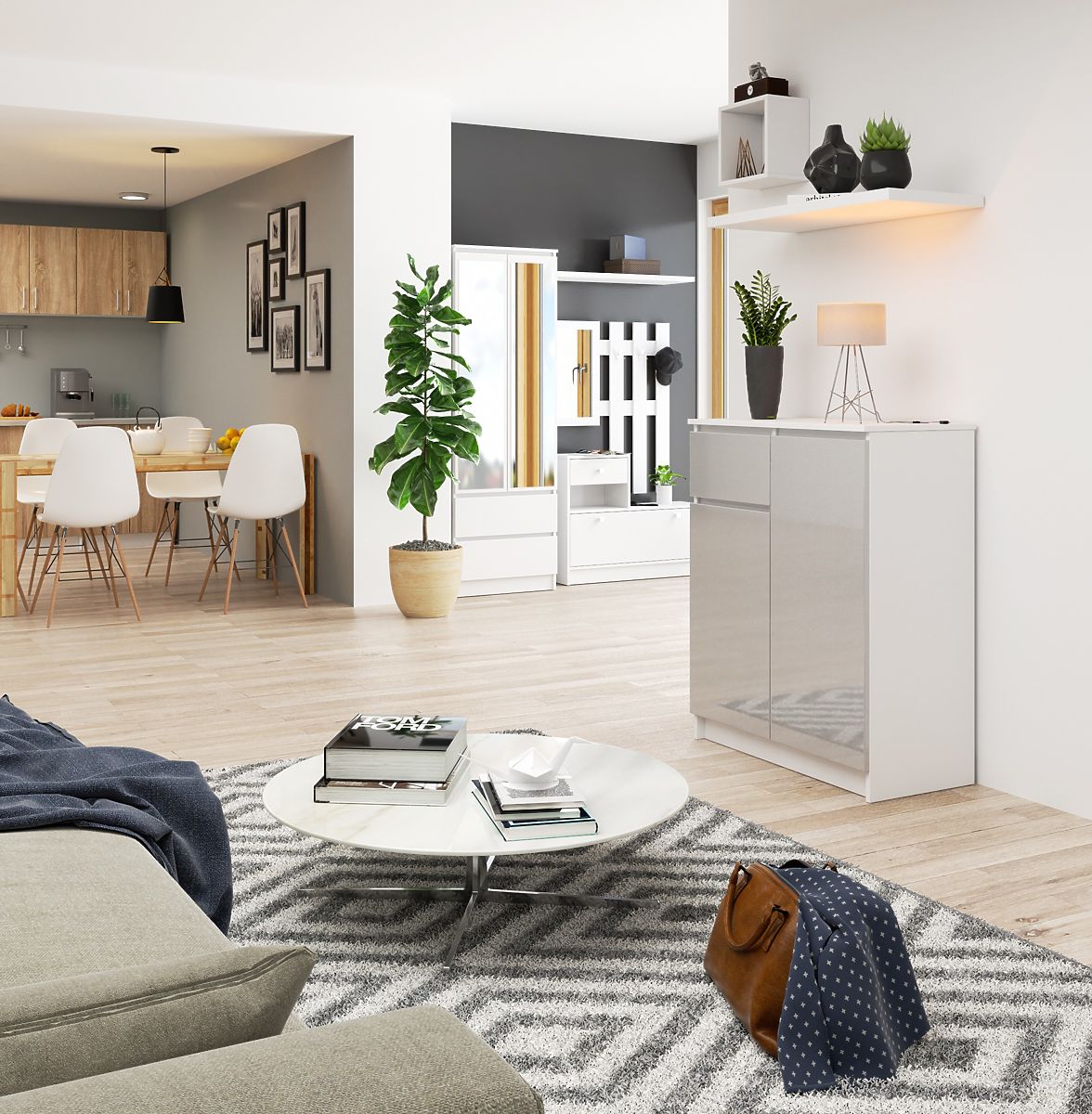 La commode K 80 blanc-métallique est un meuble moderne, voire minimaliste, tout en étant universel en termes de fonctionnalité. Elle offre de nombreuses possibilités d'utilisation - elle convient aussi bien comme commode dans une chambre d'enfant que comme meuble de rangement pour les petits objets dans le salon ou la chambre, et même comme armoire pratique pour les clés, chapeaux ou sacs à main dans l'entrée. Elle peut également parfaitement s'intégrer dans une salle à manger minimaliste.