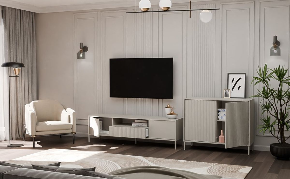 COULEUR : KAŠMÍRÉLÉGANCE ET PRATICITÉ EN UNLa commode KAMARO 2D SLIM KAŠMÍR est une combinaison d'esthétique et de fonctionnalité, idéale pour le salon, la chambre d'amis, la chambre à coucher ou le bureau. Grâce au panneau frontal rainuré des portes (rappelant des lattes), le meuble acquiert un aspect moderne et original qui s'intègre parfaitement dans les intérieurs contemporains.