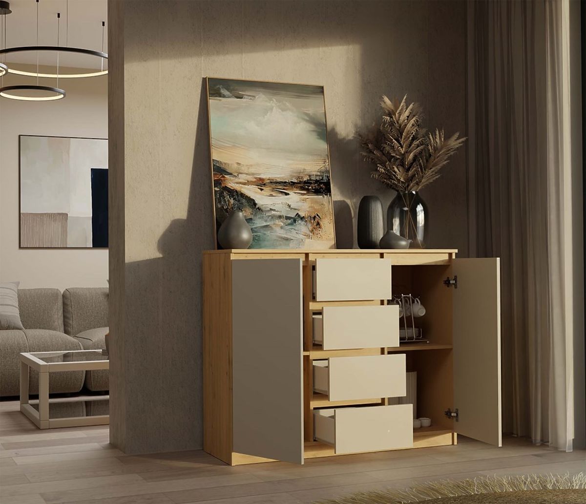 La commode 2D4S est un meuble élégant et spacieux, idéal pour la chambre, le salon, la chambre d'enfant ou l'entrée. Son apparence universelle combine simplicité et élégance, parfaite pour les intérieurs modernes et minimalistes.