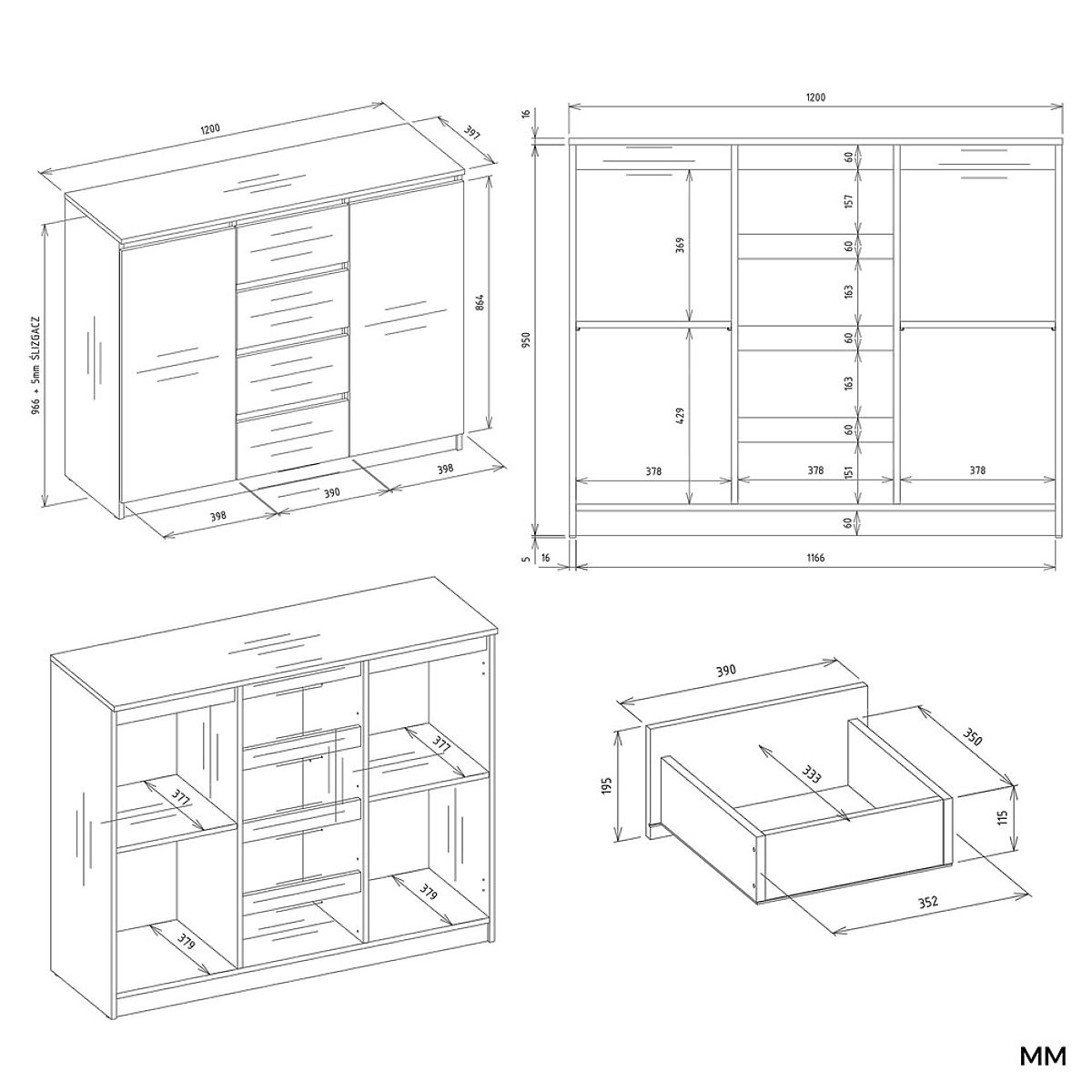 Tiroirs – montés sur des glissières à rouleaux, assurant une extraction fluide et confortable.