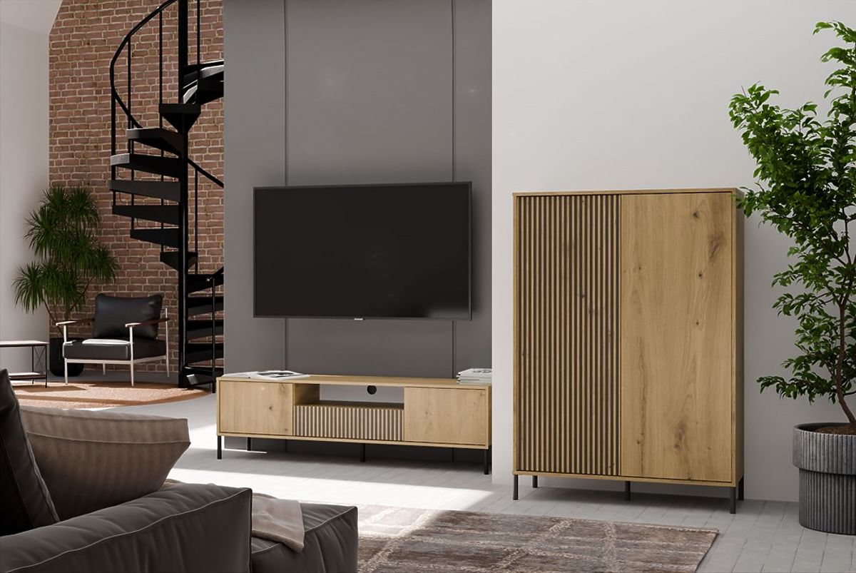 COULEUR :La vitrine KAMARO 2DD SLIM/LISSE CHÊNE ARTISAN est une combinaison d'esthétique et de fonctionnalité, idéale pour le salon, la chambre d'amis, la chambre à coucher ou le bureau. La combinaison de portes avec une façade lisse et de portes avec une façade rainurée rappelant des lamelles ajoute du caractère, tandis que le système TIP-ON permet une utilisation confortable sans poignées. Le meuble offre un espace de rangement généreux tout en étant un élément stylé dans un intérieur moderne.