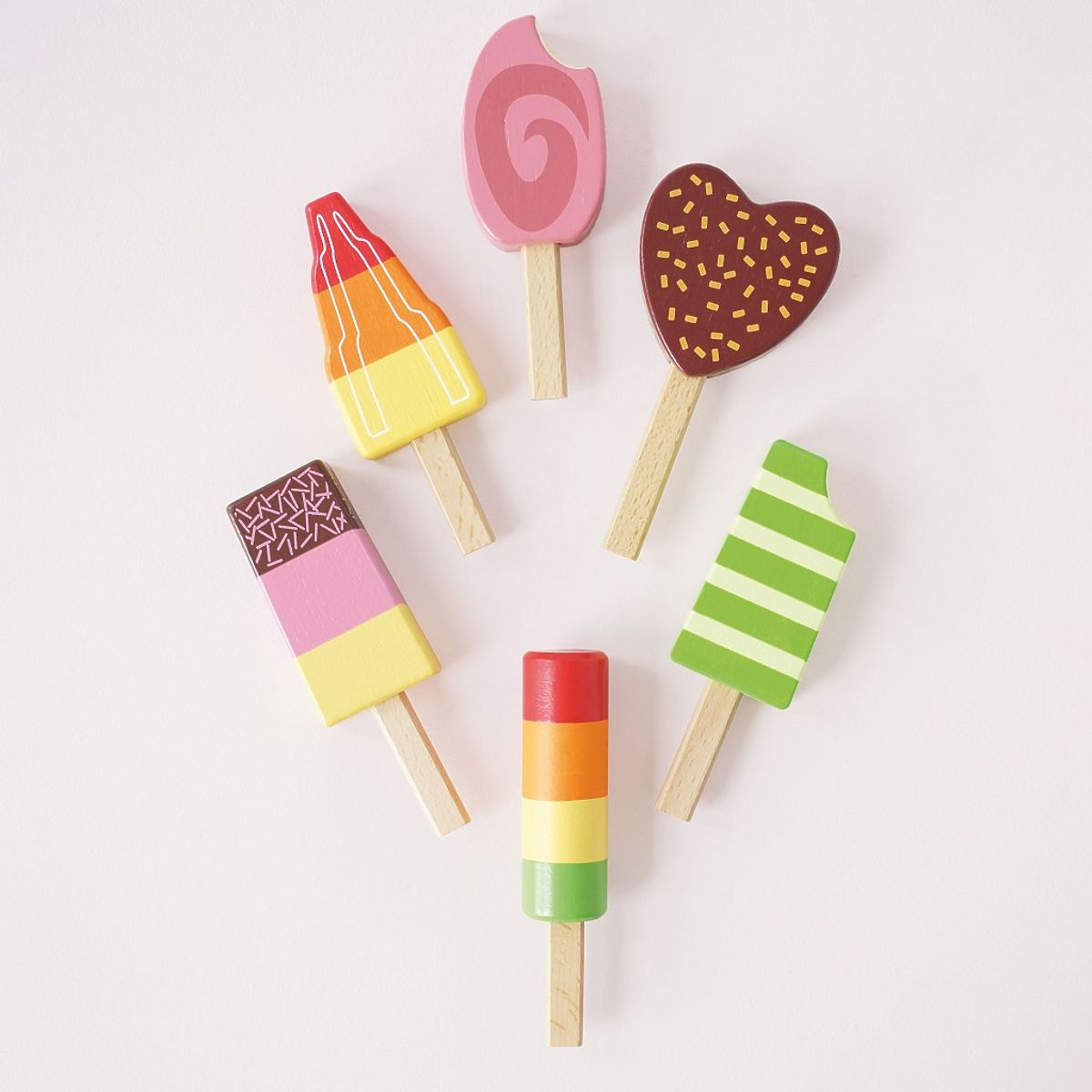 L'ensemble de six glaces peintes à la main est parfait pour un jeu imaginatif. Un jouet durable en bois de caoutchouc massif, accompagné d'un support en bois .. plus