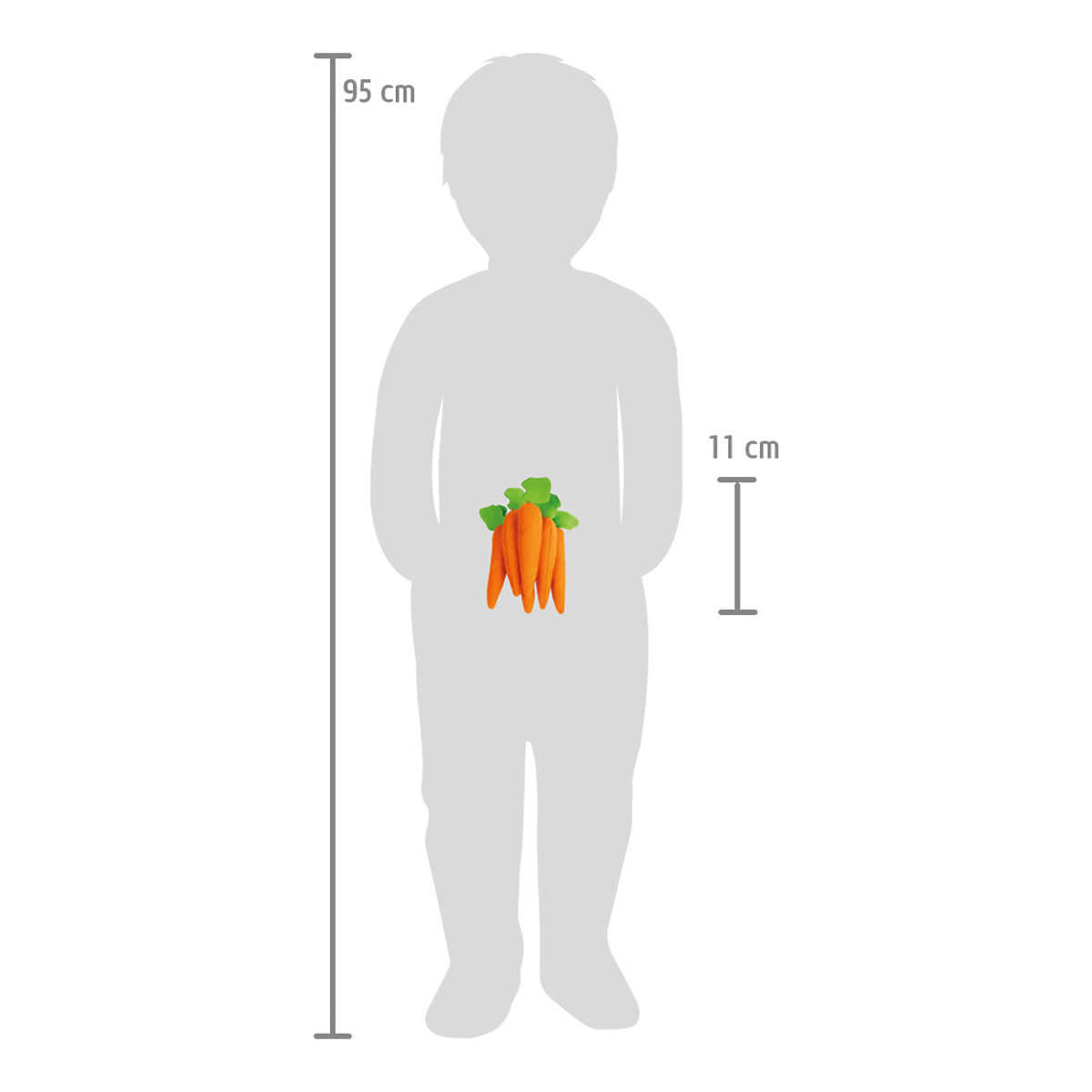 L'emballage contient 7 carottes en feutre. Ces carottes attirent l'attention et complètent chaque magasin de légumes. Les carottes conviennent également parfaitement comme nourriture pour un cheval, un poney ou un lapin. Principales caractéristiques : accessoire pour cuisine d'enfant, magasin d'alimentation ou comme nourriture pour la ferme