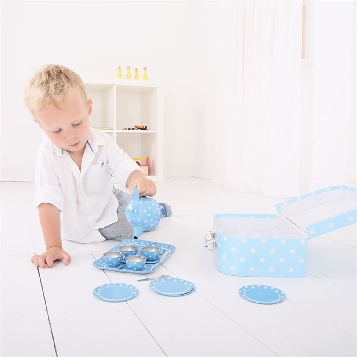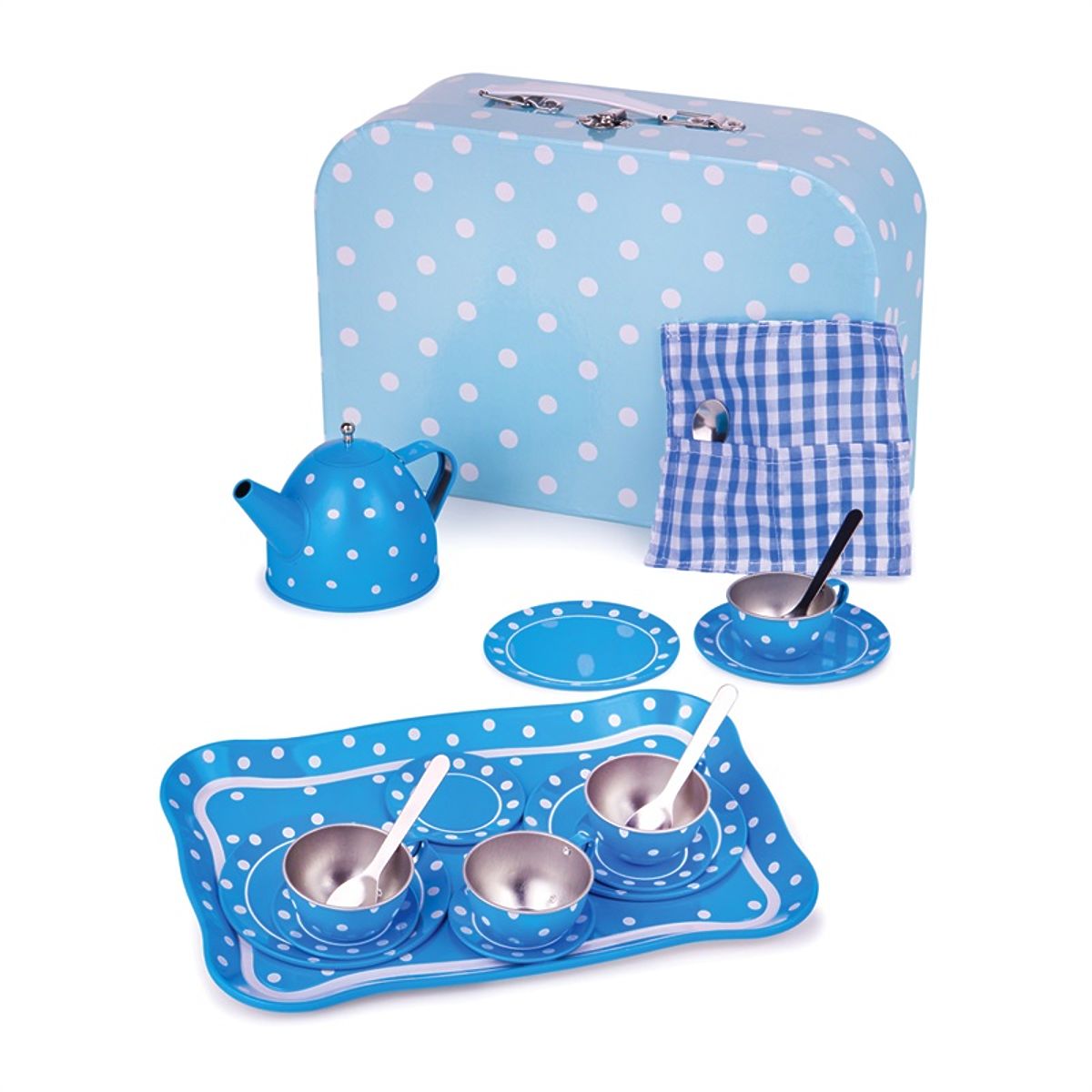 Ce magnifique service à thé à pois comprend une valise en carton contenant quatre tasses et soucoupes en métal, une théière, des cuillères, des assiettes et un plateau de service. Le set contient tout ce dont les enfants ont besoin pour un goûter. Principales caractéristiques : adapté aux voyages, excellent moyen de stimuler la créativité et l'imagination, conforme aux normes de sécurité européennes actuelles.