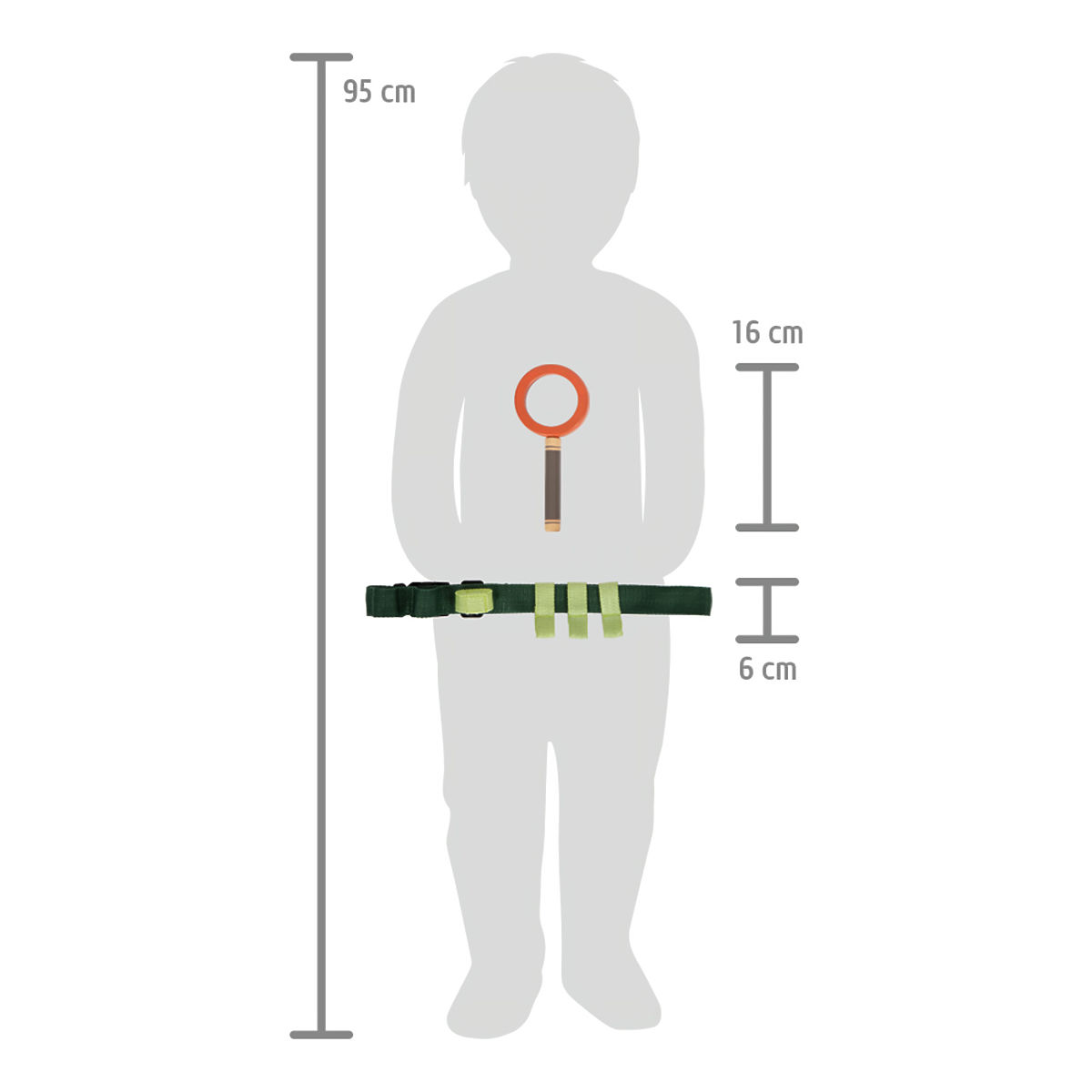 Pour les amateurs d'aventure ! Cette ceinture équipée laisse les mains des enfants libres lors de chaque aventure. Elle peut contenir tout l'équipement nécessaire : un sifflet en bois massif, une loupe, une pince, une boussole, une corde et un sac en nylon qui peut être attaché à une boucle ou un mousqueton de la ceinture. La ceinture se ferme facilement avec une boucle et est également ajustable. Elle est idéale pour les excursions, randonnées, expéditions, et grâce à l'équipement, les enfants peuvent explorer et découvrir de nouvelles choses dans le jardin, en forêt ou dans les prés. Bois visible, bords arrondis et couleurs naturelles, ce sont les jouets de la gamme "Discover". Principales caractéristiques : ceinture résistante pour jeunes explorateurs avec boucles, mousqueton, taille ajustable, inclus sifflet en bois, loupe, pince, boussole, corde et sac en tissu, joli design avec bois visible et bords arrondis, compatible avec d'autres produits de la gamme "Discover"