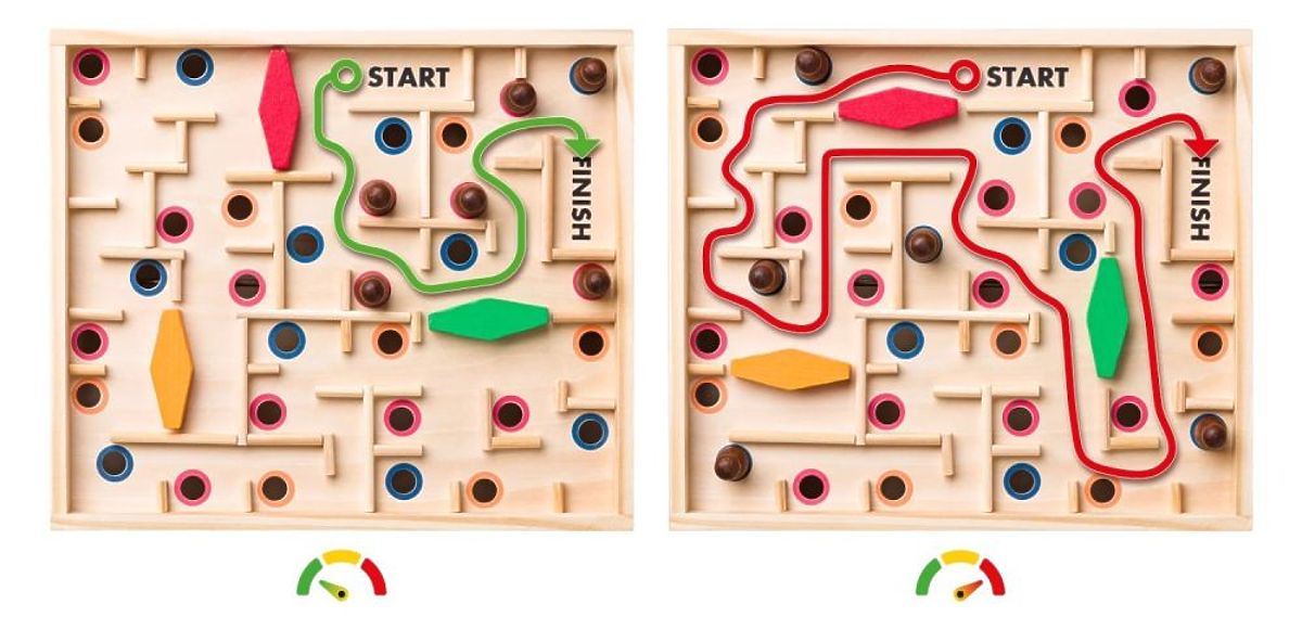 Le principe de fonctionnement est très simple - il faut amener la bille du point de départ marqué "START" au point d'arrivée marqué "FINISH". Et c'est là que s'arrête la simplicité de ce jeu amusant, car la bille se déplace très facilement dans le labyrinthe et tombe facilement dans un trou - ce qu'il faut éviter. Tout au long du labyrinthe, des trous sont répartis. Souvent, ce sont des endroits d'angle ou des endroits nécessitant une manœuvre, ce qui rend le jeu encore plus difficile. Heureusement, le jeu comprend un ensemble de 6 figurines avec lesquelles vous pouvez boucher les trous "les plus détestés" ou tout autre. Le nombre de figurines utilisées est libre, lors des premières parties, vous pouvez utiliser toutes ou un grand nombre. Une fois que vous avez acquis de l'expérience, vous pouvez progressivement réduire le nombre de figurines ou les éliminer complètement et introduire un nouveau niveau de jeu "hardcore" :)
