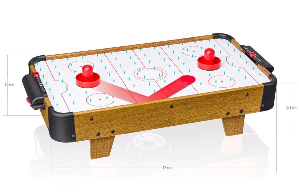 La table de jeu est presque prête à l'emploi dès la sortie de la boîte, il suffit de monter deux buts avec un compteur de points et les pieds. Une fois le jouet allumé, le palet glisse très facilement d'un but à l'autre. Chaque joueur, équipé d'un frappeur spécial, doit défendre son but tout en essayant de renvoyer le palet dans le but adverse. Amusement garanti et beaucoup d'émotions.