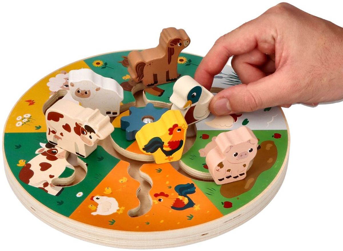 Le puzzle est fabriqué en bois. Sur la base en bois, il y a un labyrinthe et 6 animaux ainsi qu'un élément rotatif au centre. Vous y trouverez : une poule, une vache, un mouton, un cheval, un canard et un cochon.