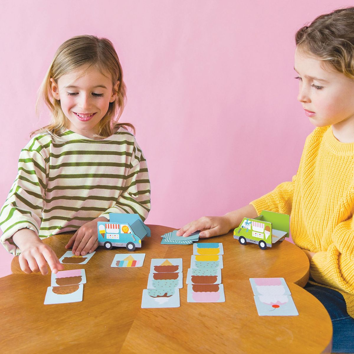 Gourmands, unissez-vous ! Le jeu le plus savoureux sans sucre ajouté. Assemblez des cornets de glace et ajoutez des garnitures dans ce puzzle amusant. Collectez le plus de boules de glace possible pour gagner, mais n'oubliez pas les garnitures ! Principales caractéristiques : 52 cartes illustrées et 4 camions de glace. Jeu pour 2 à 4 joueurs, durée moyenne de jeu 10 minutes. Fabriqué à partir de matériaux recyclés, imprimé avec des encres végétales. De 4 à 8 ans. Conforme à toutes les normes de sécurité.