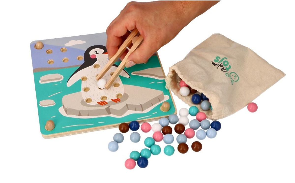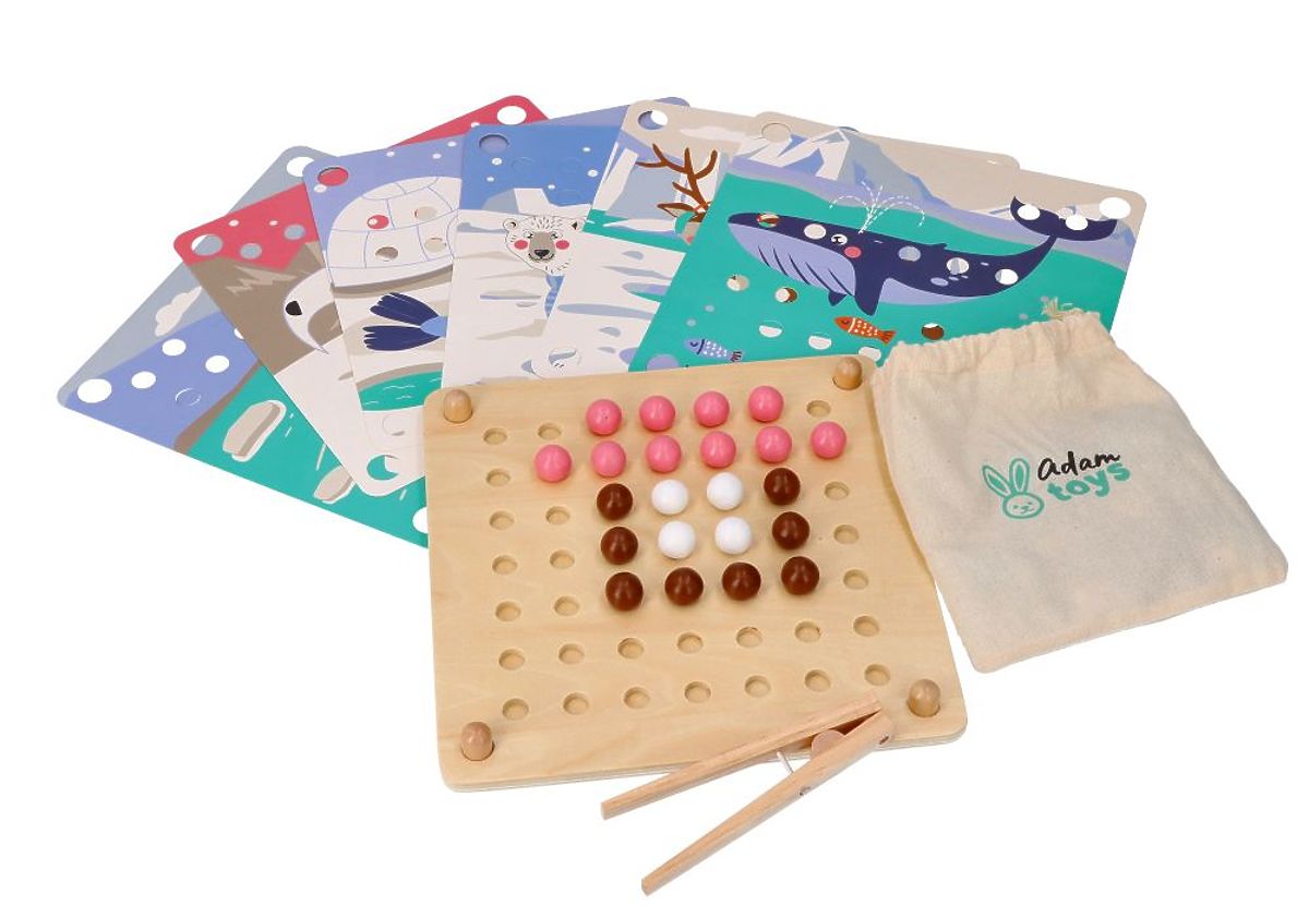 Une autre excellente offre du célèbre fabricant de jouets Adam Toys. Cette fois, il s'agit d'un puzzle de compétences avec de nouveaux héros arctiques. Le set se compose d'une base en bois avec des trous percés, de 6 plaques colorées avec des animaux de la série et de 71 billes colorées et d'une pince en bois.