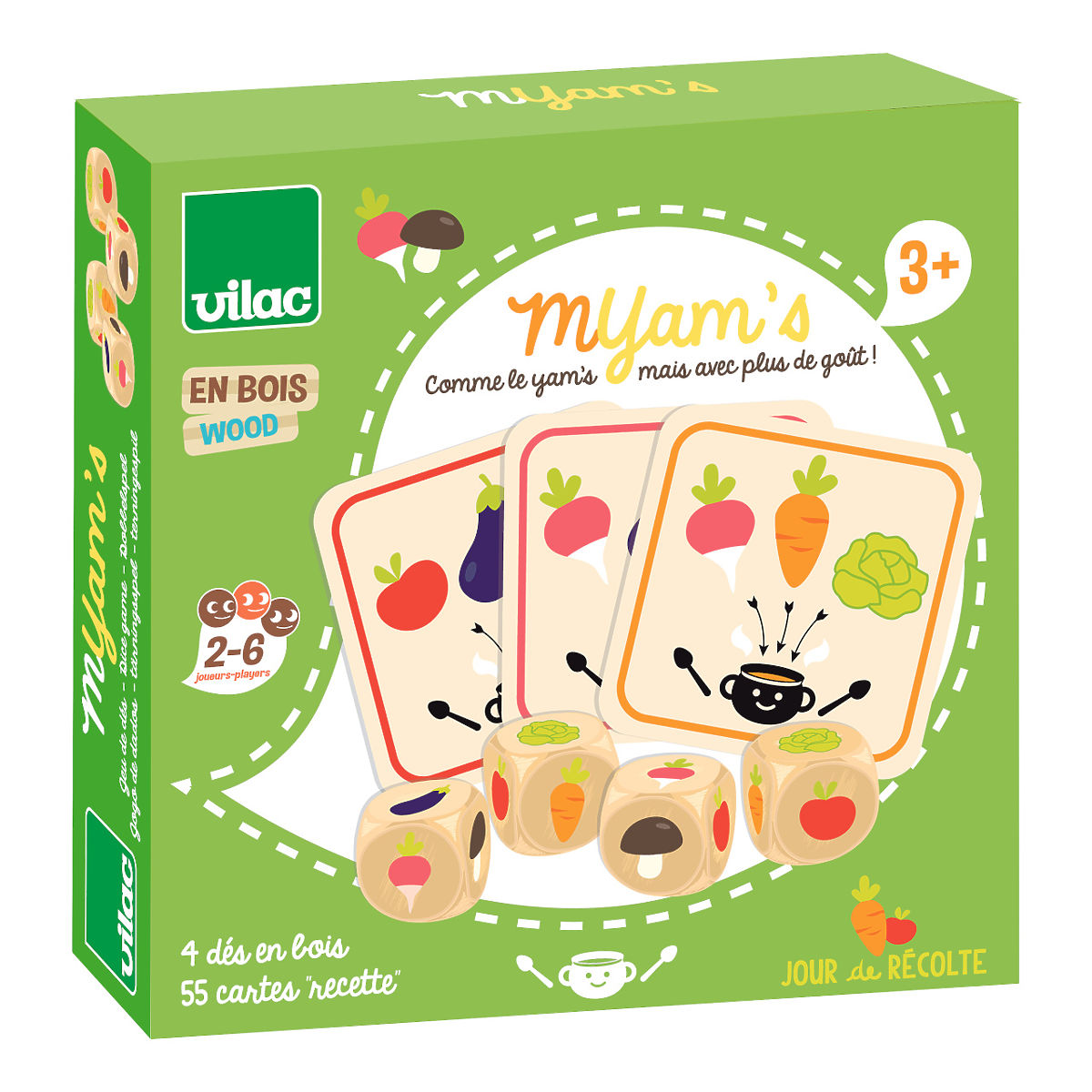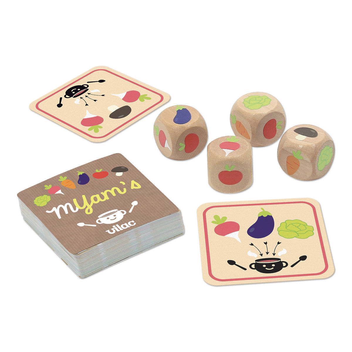 Non seulement les végétaliens apprécieront ce jeu de légumes amusant ! Piochez une carte de recette et essayez de lancer la combinaison illustrée sur les dés. Qui aura plus de chance et collectera plus de cartes ? Grâce à des règles simples et des images, même les plus jeunes peuvent jouer, tandis que les plus âgés peuvent pimenter le jeu en comptant et en attribuant différentes valeurs à chaque type de légume. Principales caractéristiques : 55 cartes de jeu et 4 dés pour 2 à 6 joueurs, design et finition attrayants. Règles abrégées du jeu : Le but du jeu est de créer des combinaisons correspondant aux cartes de recettes à l'aide des dés. Distribuez 3 cartes de recettes à chaque joueur. Les joueurs jouent à tour de rôle. Le tour commence par un lancer de dés. Les joueurs ont 3 lancers par tour. Au premier lancer, ils lancent les trois dés, puis ils peuvent relancer tous les dés ou seulement certains d'entre eux. Si un joueur obtient une combinaison qui correspond à l'une de ses cartes de recettes, il gagne cette carte. Ensuite, il pioche une nouvelle carte. Le gagnant est le premier joueur à obtenir 10 cartes de recettes.
