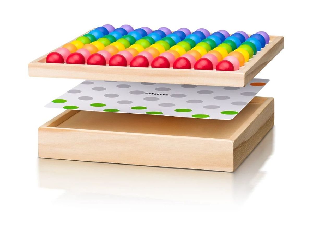 Ensemble de jeux multifonctionnel pour toute la famille, où chacun trouvera son bonheur. Cette boîte en bois avec des billes colorées cache jusqu'à 7 scénarios de jeu possibles, tant pour le jeu en solo que pour le jeu en groupe. L'ensemble se compose d'une boîte en bois avec un couvercle perforé de 81 trous, dans lesquels s'insèrent parfaitement de petites billes (9 pièces dans 9 couleurs). Le jeu est accompagné d'un dé en bois, d'un manuel et de 15 cartes modèles (à insérer sous le couvercle perforé selon le jeu que nous allons jouer).