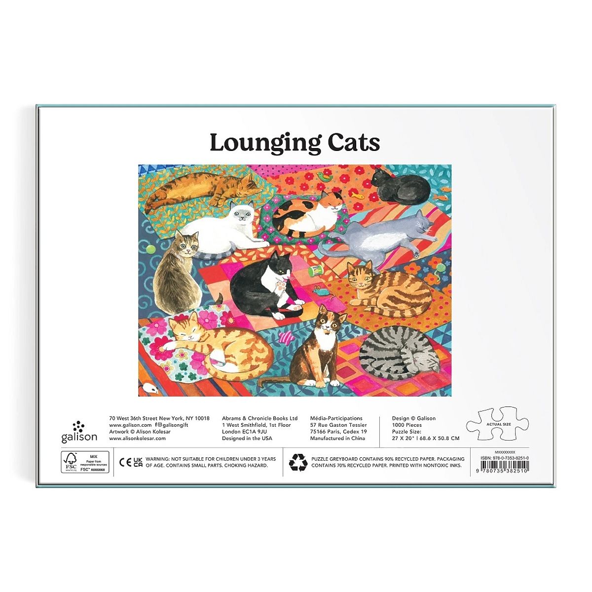 Ce puzzle de 1000 pièces présente une sélection variée de compagnons félins se prélassant sur des couvertures et coussins colorés. L'image est l'œuvre de .. plus