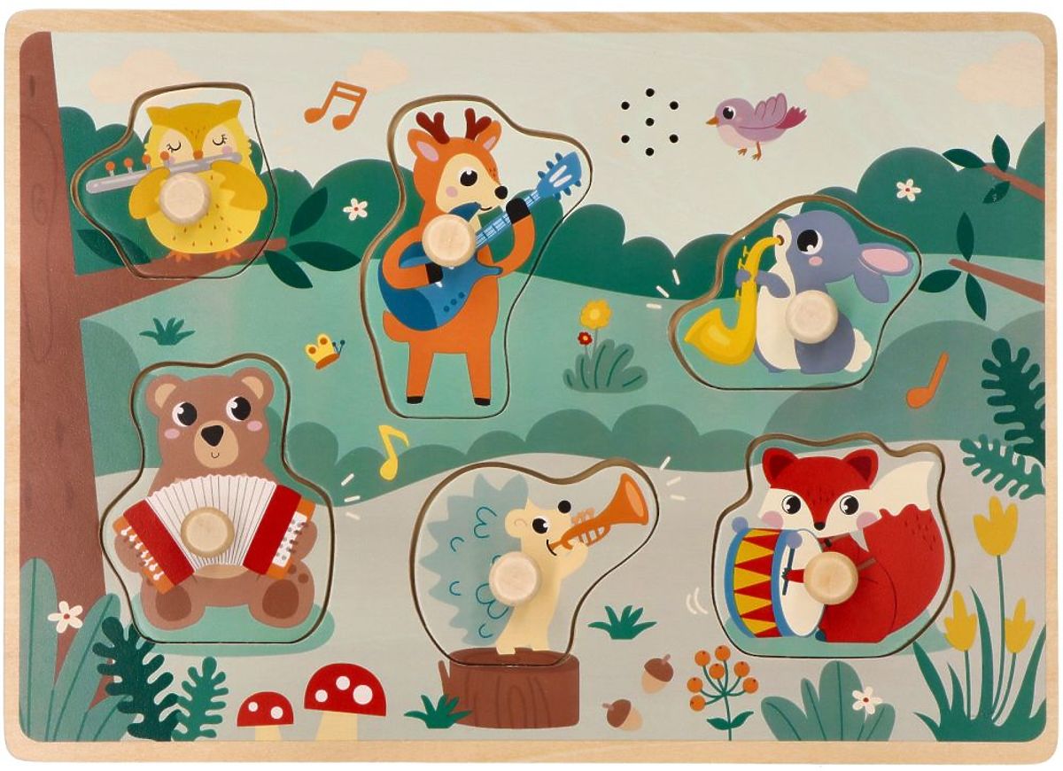 Une autre offre sonore d'Adam Toys à côté du puzzle ferme et safari. Cette fois, nous faisons connaissance non seulement avec les animaux de la forêt, mais aussi avec les sons de divers instruments. Le but est bien sûr d'adapter la forme de l'animal à l'emplacement correct sur le puzzle. S'il réussit, il entendra comme récompense le son de l'instrument joué par chaque animal. Ce jouet éducatif développe parfaitement l'imagination des enfants, enseigne la concentration et les capacités d'observation. L'enfant exerce également ses compétences manuelles, notamment ses doigts, et le son l'encourage à jouer.