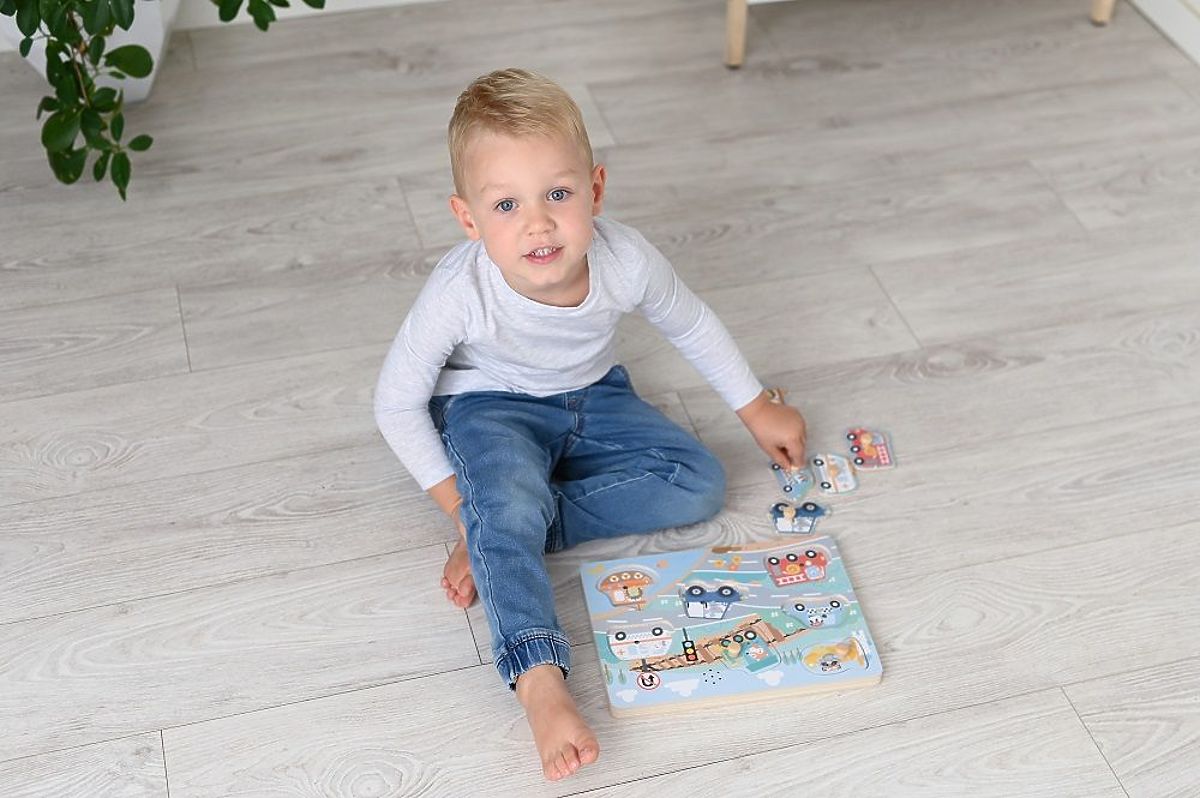 Encore un puzzle musical ? On n'en a jamais assez ! Cette fois, il s'agit d'un puzzle sonore de la marque Adam Toys, une autre proposition de cette entreprise - à côté des puzzles sur le thème de la ferme, safari ou des outils. Cette fois, nous rencontrons nos amis de la forêt conduisant divers véhicules. Le but est bien sûr d'adapter la forme de l'animal à la bonne place sur le puzzle. Si l'enfant réussit, il entendra comme récompense le son de la machine dans laquelle se trouve l'animal, par exemple : renard conducteur de train, raton laveur pilote ou ours pompier :)