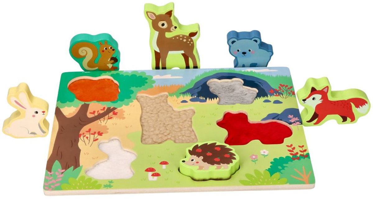 L'intérieur de chaque ouverture pour le puzzle est recouvert d'un matériau doux dont la couleur et la texture se rapprochent de la fourrure de l'animal correspondant. De plus, les enfants peuvent jouer avec les blocs séparément et créer leurs propres histoires et spectacles. Jouer avec des objets de textures différentes stimule non seulement le toucher, mais aussi la perception visuelle. Le puzzle est fabriqué en bois laqué dans des couleurs agréables. Le jouet développe parfaitement l'imagination des enfants, enseigne la concentration et les capacités d'observation. L'enfant exerce également ses compétences manuelles, en particulier ses doigts.
