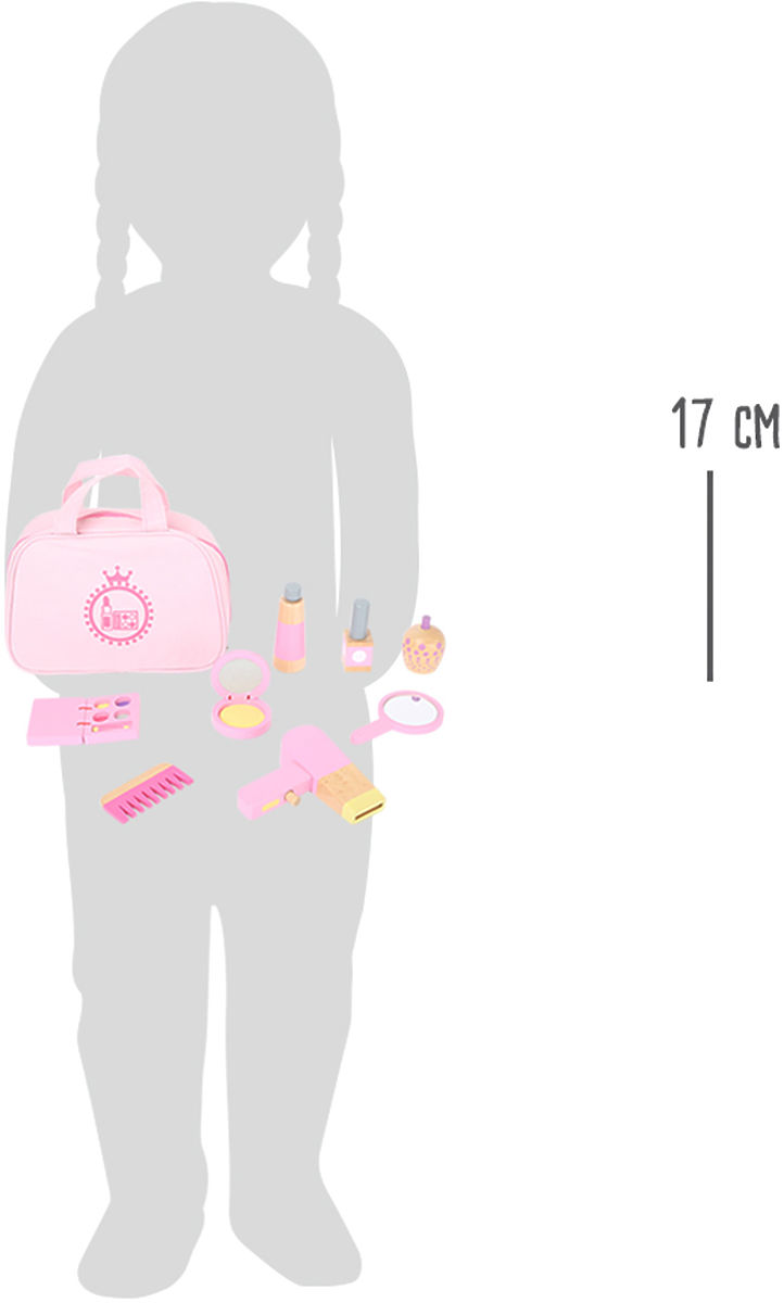 Miroir, miroir, qui est la plus belle... dans cette chambre d'enfant ? Le concours de beauté peut commencer avec cette adorable trousse de maquillage remplie d'accessoires en bois roses. Sèche-cheveux, peigne, vernis à ongles, parfum, poudre et ombre à paupières sont ce qu'une jeune coquette devrait avoir. Les flacons en bois laqué se rangent soigneusement dans la trousse portable. Principales caractéristiques : contient une trousse et 8 accessoires, développe le jeu de rôle