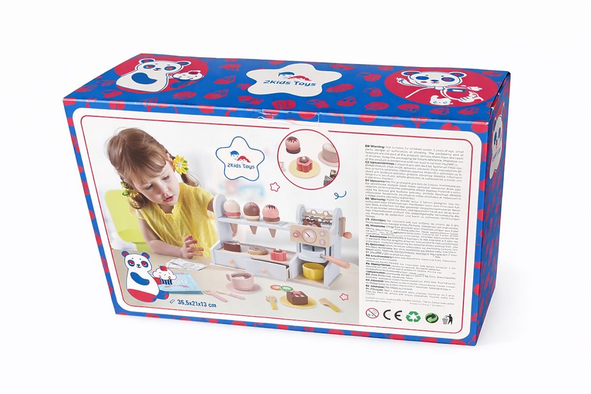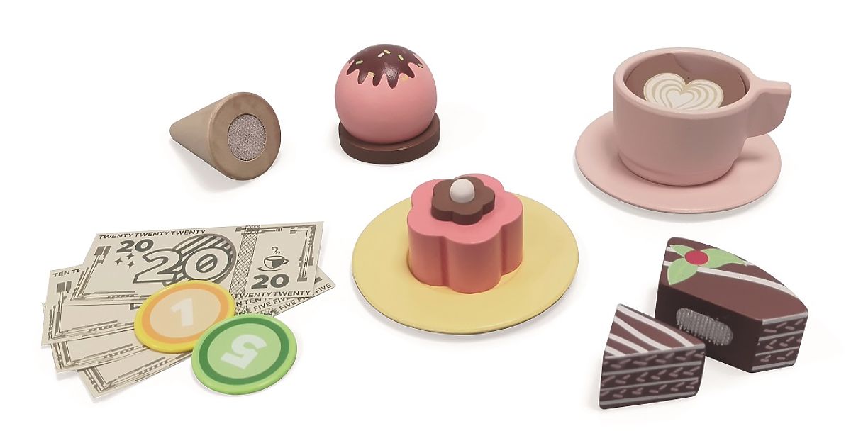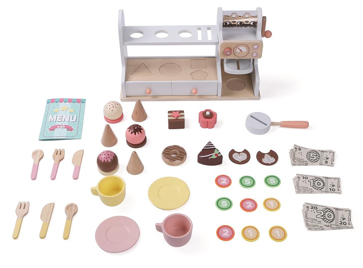 Devenez un véritable barista ou commerçant ! Vous souhaitez une glace, un gâteau ou simplement un délicieux café ? Avec cet ensemble de 46 pièces, vous profiterez d'heures de divertissement. L'ensemble propose des tasses avec soucoupes, des couverts et des cuillères, un comptoir avec machine à café, une vitrine avec des gâteaux et une étagère avec des trous pour les glaces. Il y a aussi des tiroirs avec un espace de rangement pour l'argent, qui fait également partie de cet ensemble. Les jouets de jeu de rôle libèrent l'imagination des enfants et les inspirent à un jeu créatif, ce qui a également un impact positif sur leur vocabulaire et le développement de la langue. Principales caractéristiques : contient 46 pièces, favorise le développement du langage et du vocabulaire.