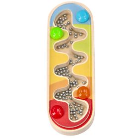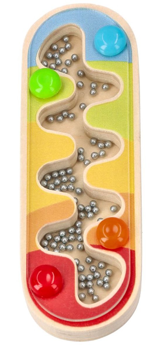 Le jouet est conçu comme suit : la base et le boîtier du produit sont en bois, la plaque transparente est en plastique, tandis que les billes à l'intérieur sont en métal. La découpe en forme de zigzag permet aux billes de descendre lentement de haut en bas. Un excellent petit cadeau à offrir pour toute occasion :)
