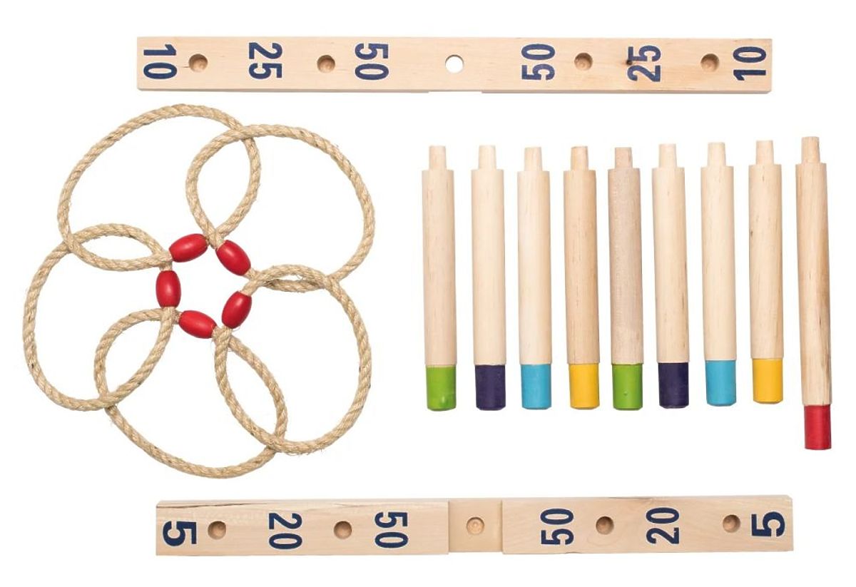 Le jeu est fabriqué en bois, avec des piquets en bois colorés marqués de points sur deux planches croisées. Nous visons ces piquets avec des anneaux en corde, et si l'anneau atterrit sur le piquet, nous gagnons le nombre de points correspondant. Le jeu peut être joué par deux à huit personnes en même temps.