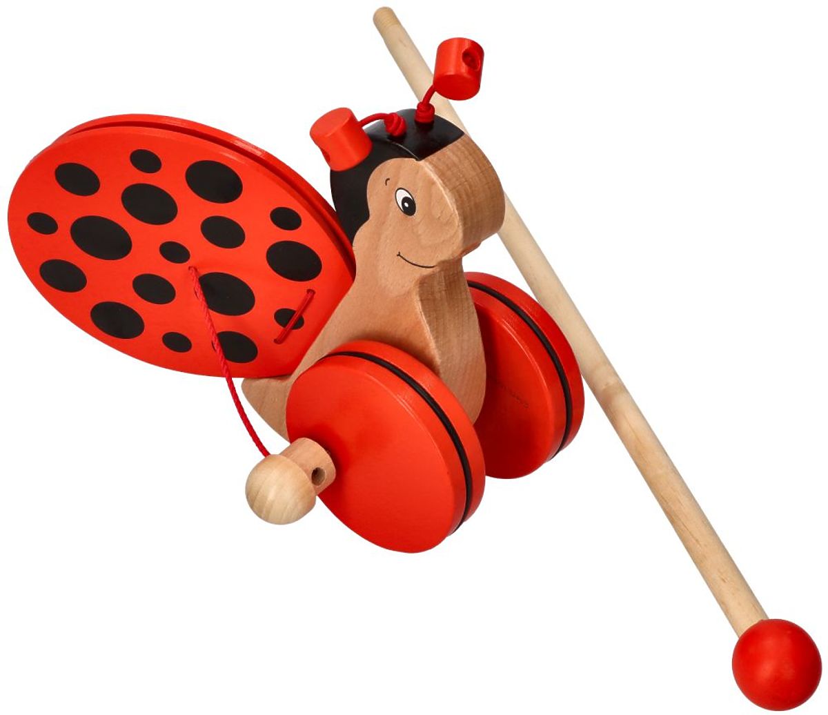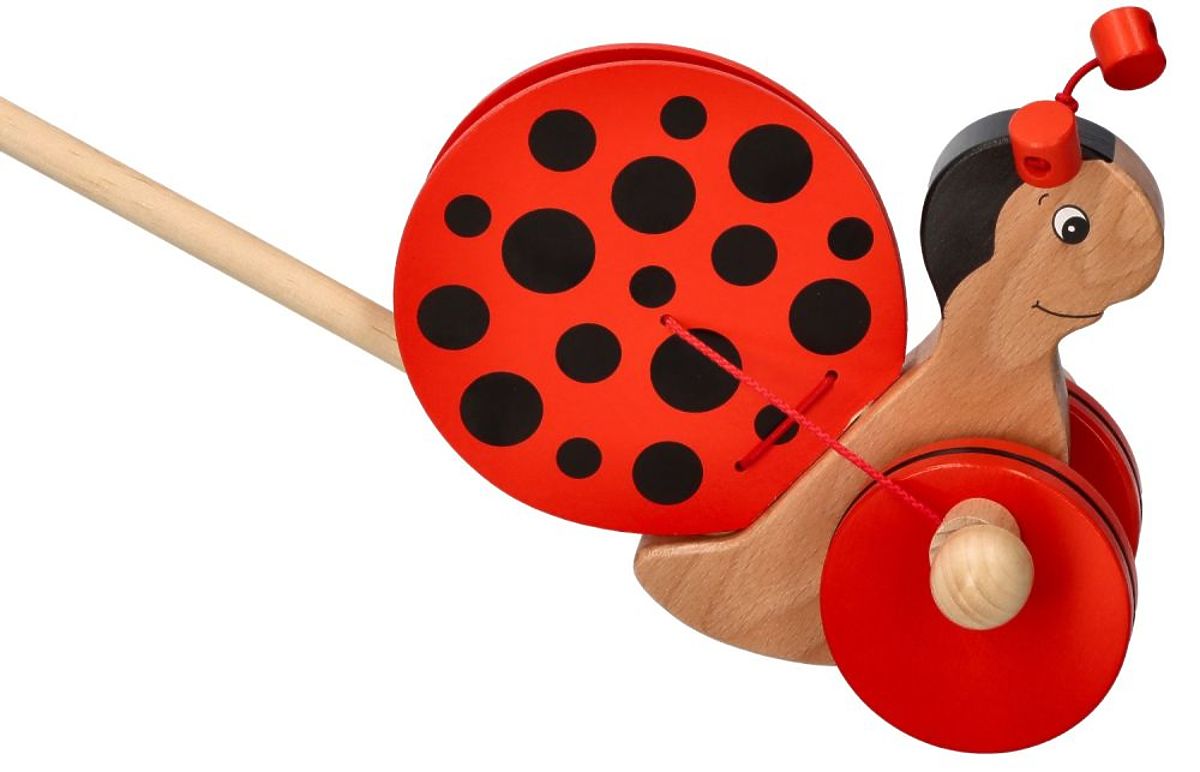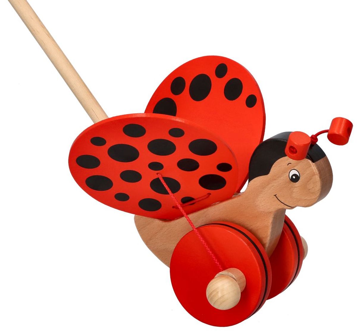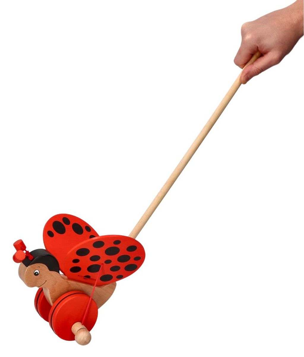 Le jouet aide l'enfant à faire ses premiers pas et l'encourage à marcher. Grâce au bâton en bois, le tout-petit de son petit ami peut pousser devant lui et le regarder bouger gaiement ses ailes. L'attention de l'enfant est attirée sur la couleur rouge avec des pois noirs contrastés.