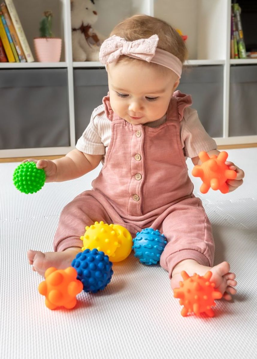Ensemble de huit ballons sensoriels destinés au massage du corps, à la rééducation, aux exercices de gymnastique ou même au bain. Grâce à la diversité des ballons en termes de texture, de couleur et de poids, ils sollicitent les sens les plus importants de l'enfant pour enrichir son expérience et lui permettre diverses activités.