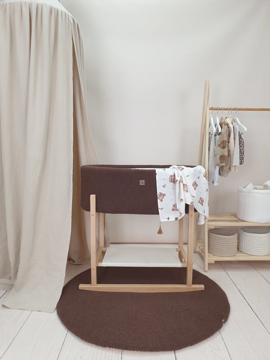 Le couffin est fait main à partir de matériaux de qualité. La base en bois de hêtre assure la stabilité, tandis que les côtés en mousse anti-allergique et le tissu doux Teddy (bouclé) offrent confort et douceur. L'intérieur est en jersey de coton pour garantir un environnement agréable pour le bébé.