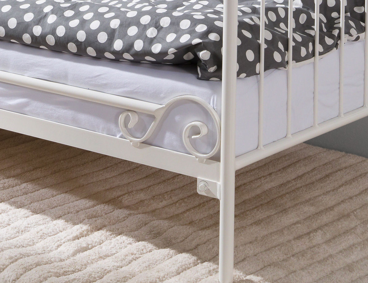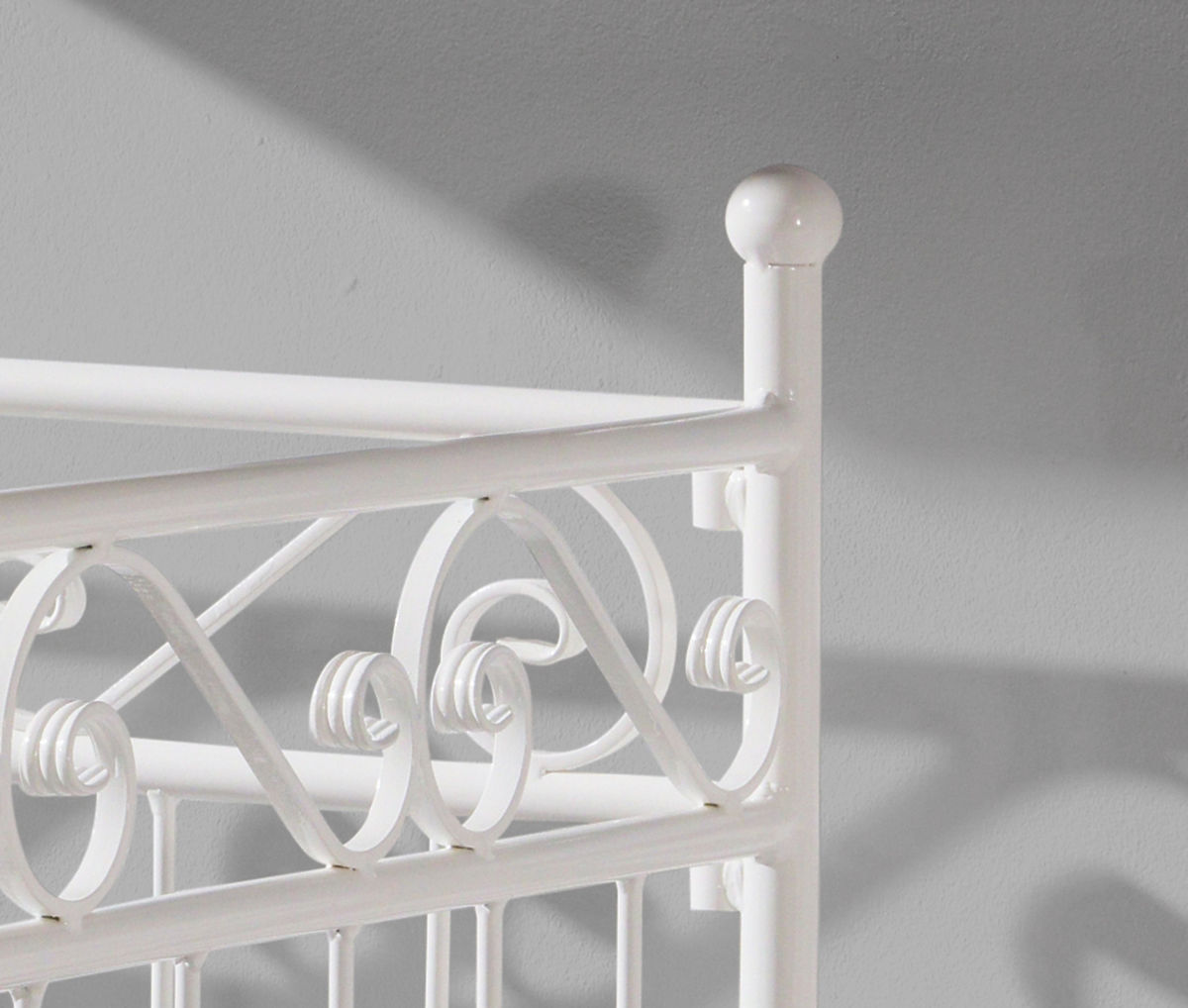 Les pieds du lit sont en métal sous forme d'une section circulaire avec un diamètre de 27 mm. Les barres ont un diamètre de 21 mm. Le remplissage est fait de barreaux en métal avec un diamètre de 8 mm. Le lit est équipé d'un sommier à lattes en bois.