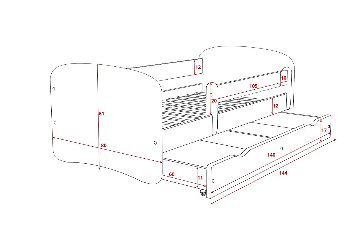 Balení obsahuje postel, zábranu a rošt. Délka zábrany 100 cm.