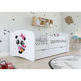 Dětská postel s polepem kreslené Pandy na bílém pozadí. Černobílá panda má veliké roztomilé oči a sladký dortík v tlapce. Nechybí ani spousta srdíček, což z téhle postele dělá vhodný kus dětského nábytku do pokojíčku pro holky.