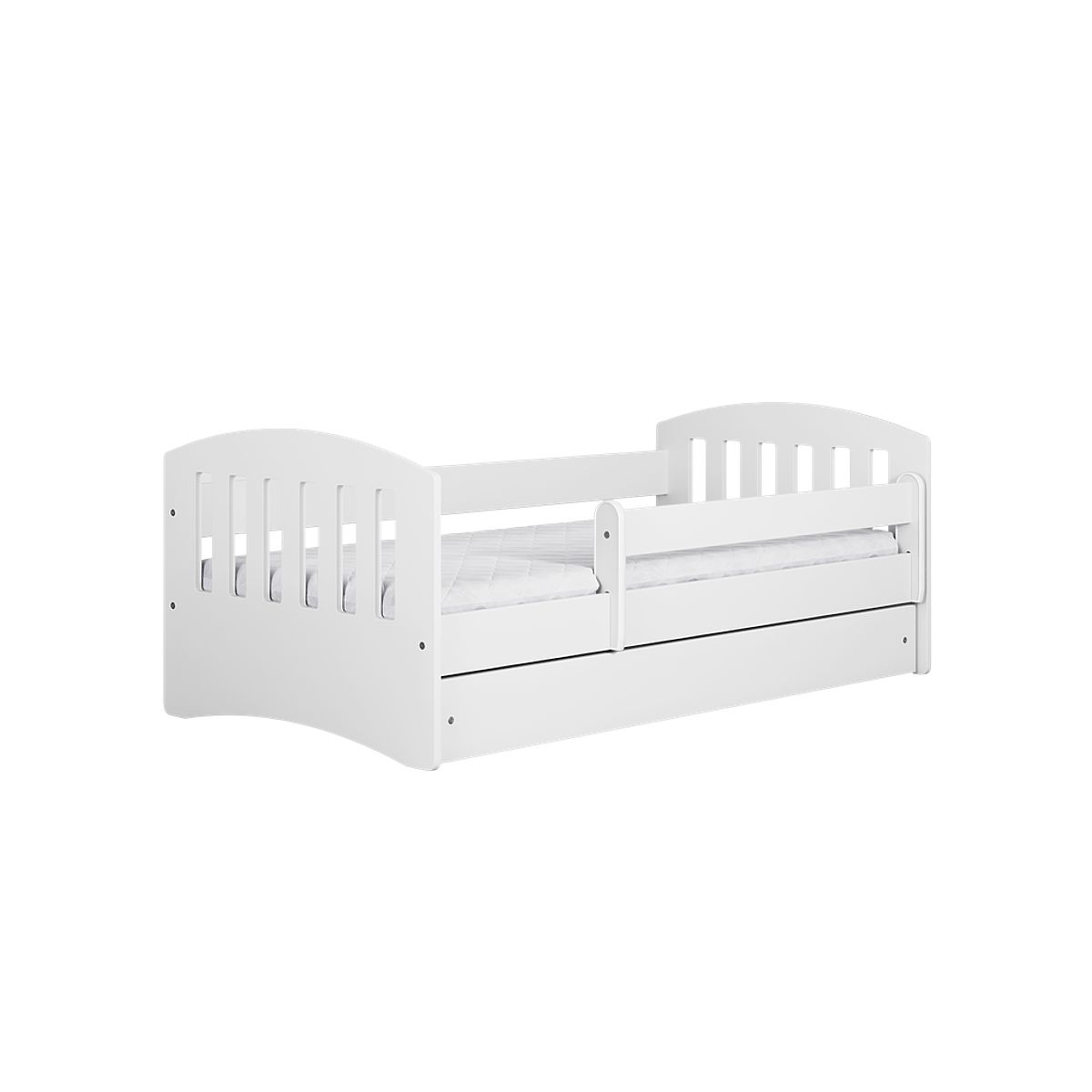 Lit d'enfant Classic en blanc pur avec barrière, sommier et espace de rangement inclus. La couleur blanche élégante convient à toutes les chambres d'enfants, que ce soit pour les garçons, les filles ou un intérieur neutre. Le lit entier est entièrement blanc, y compris la tête et les côtés. Si vous cherchez un lit intemporel pour la chambre d'enfant, vous l'avez trouvé.