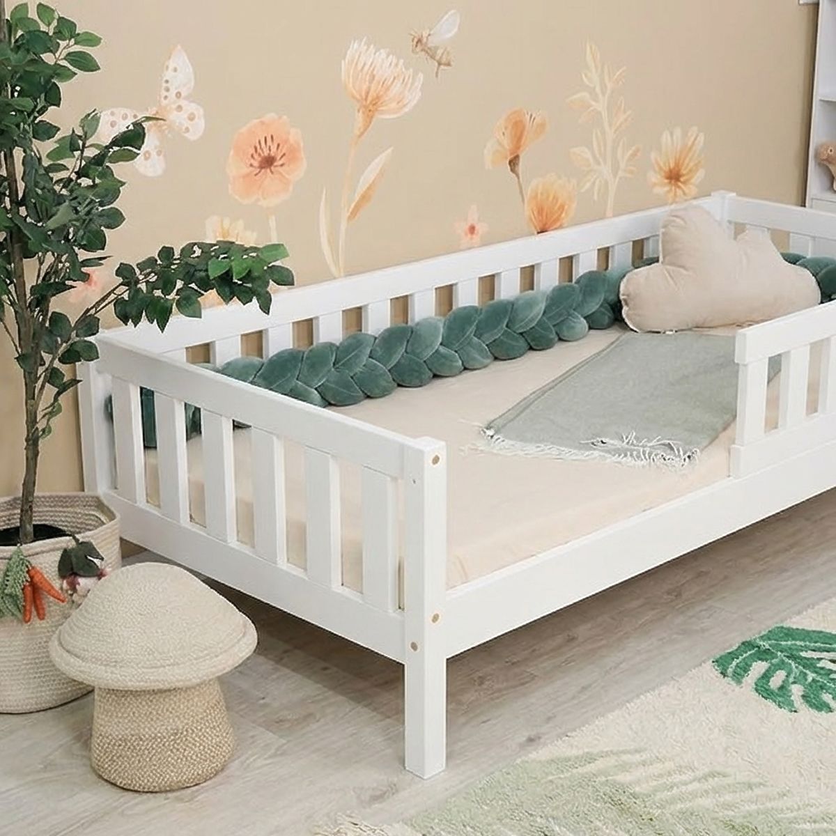Le lit d'enfant moderne Montessori Meadow en blanc est conçu selon les principes Montessori, qui encouragent l'autonomie et le développement naturel de l'enfant. Grâce à sa structure sur pieds, le lit semble aéré tout en offrant une possibilité pratique d'utiliser l'espace de rangement sous le lit. Le lit offre un espace sûr et confortable pour dormir, se reposer et jouer au quotidien. La finition verte apporte une touche fraîche et ludique qui égayera magnifiquement chaque chambre d'enfant.