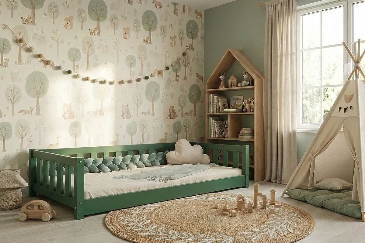 Lit enfant bas Montessori vert avec barrière pour autonomie et sécurité. .. plus