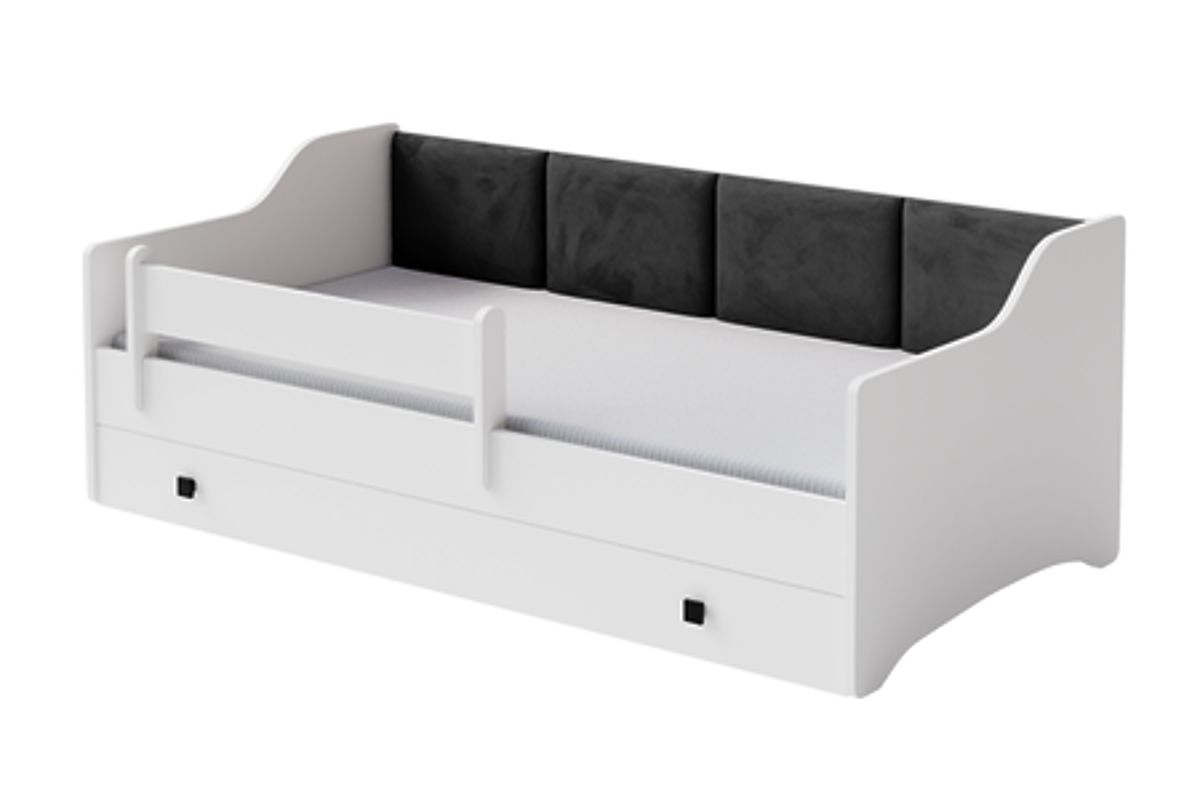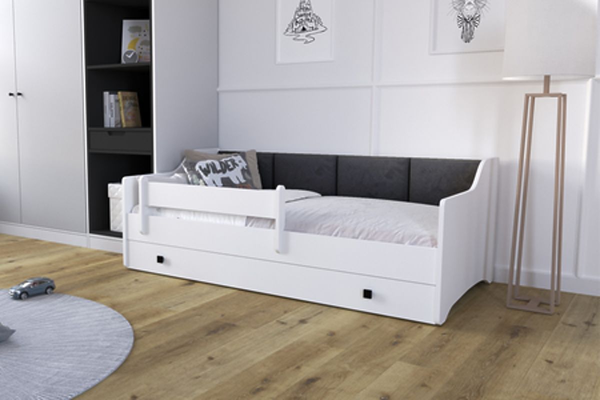 La multifonctionnalité du modèle Eryk en fait un meuble qui sert non seulement pour dormir, mais aussi pour le rangement. Le lit est équipé d'un tiroir pratique sur roulettes, idéal pour ranger le linge de lit, les jouets ou d'autres accessoires pour enfants. Cet espace supplémentaire permet de maintenir facilement l'ordre dans la chambre d'enfant tout en économisant de la place. Le rembourrage doux et la barrière de protection amovible garantissent un sommeil confortable et sécurisé pour l'enfant, faisant du lit une solution idéale pour toute chambre d'enfant. La construction solide et la finition esthétique garantissent que le lit Eryk servira pendant de nombreuses années, offrant confort à l'enfant et tranquillité d'esprit aux parents.