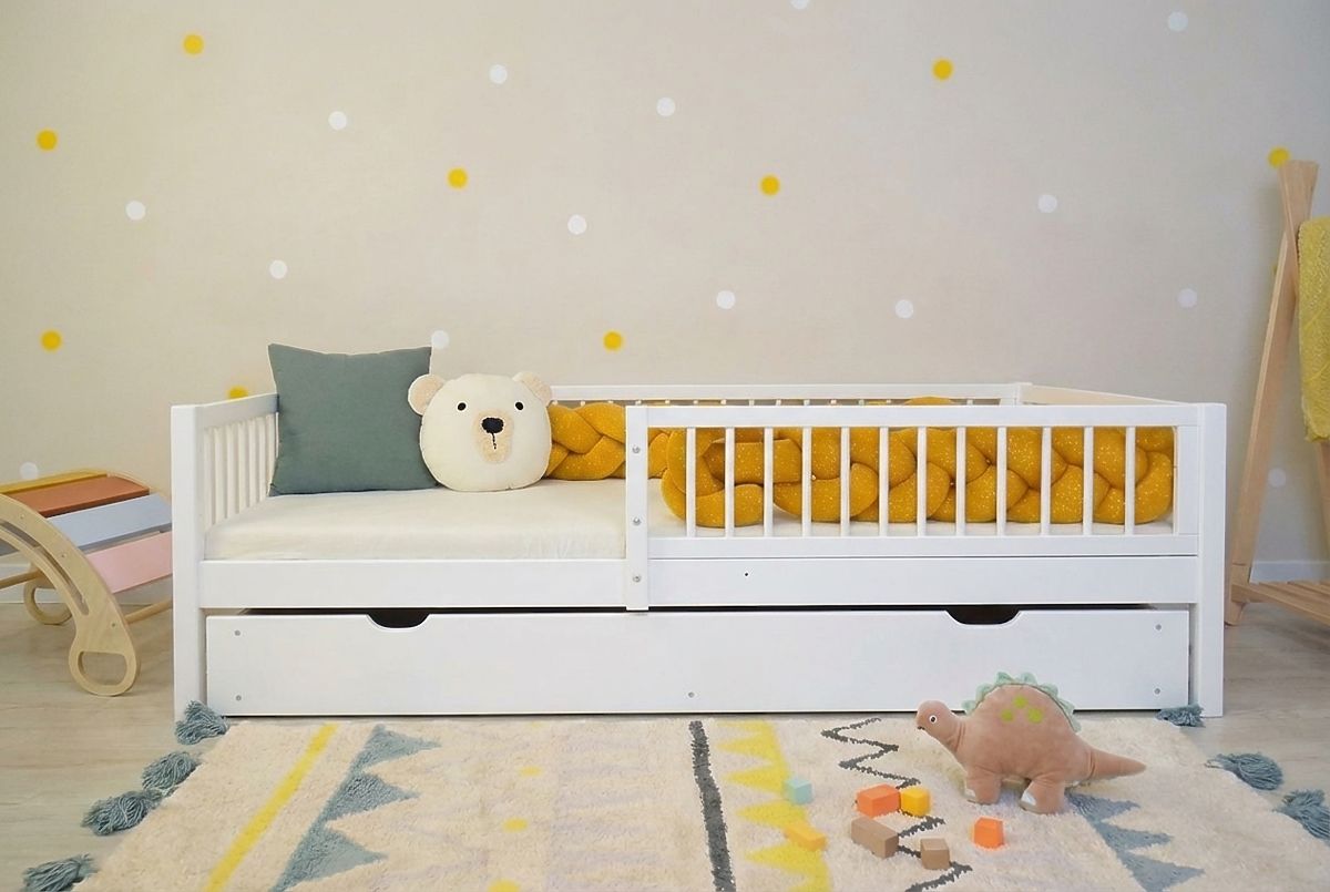 Le lit enfant Teddy, à la fois stylé et pratique, dans une élégante couleur blanche, assure à votre enfant un sommeil sûr et confortable. Le lit est laqué avec une peinture écologique certifiée, approuvée pour l'utilisation sur les meubles. Sa construction robuste offre une longue durée de vie et, grâce à son design réfléchi, le lit est non seulement sûr mais aussi fonctionnel. Il s'intègre facilement dans toute chambre d'enfant.
