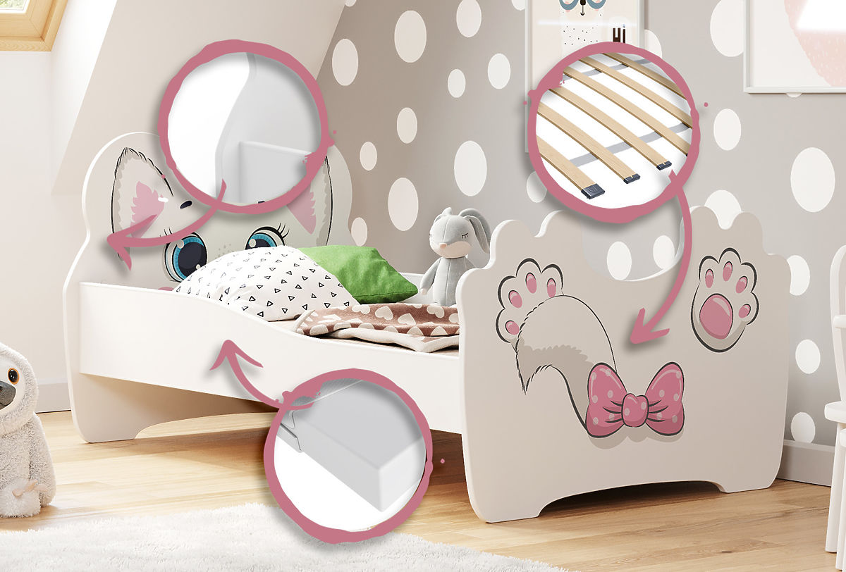 Le lit a été conçu en tenant compte du confort et de la sécurité de l'enfant, et sa construction solide assure stabilité et durabilité pour de nombreuses années. Il est accompagné d'un matelas en mousse confortable qui offre un soutien adéquat pour la colonne vertébrale, favorisant un sommeil sain. De plus, il est équipé d'une housse amovible, ce qui facilite le maintien de l'hygiène et de la propreté dans la chambre d'enfant. Le sommier FLEX avec des lattes flexibles garantit que le matelas s'adapte mieux au corps de l'enfant, augmentant ainsi le confort du sommeil. Le souci du détail est visible dans la construction sécurisée - tous les bords sont soigneusement arrondis, minimisant le risque de blessures. La hauteur appropriée des côtés du lit empêche l'enfant de tomber accidentellement pendant le sommeil, assurant un repos paisible et sécurisé. L'impression UV unique est réalisée avec des couleurs non toxiques et sûres, ce qui la rend résistante à l'abrasion, à la décoloration et à une utilisation intensive. Le lit non seulement a une belle apparence, mais répond également aux normes les plus élevées de qualité et de durabilité.