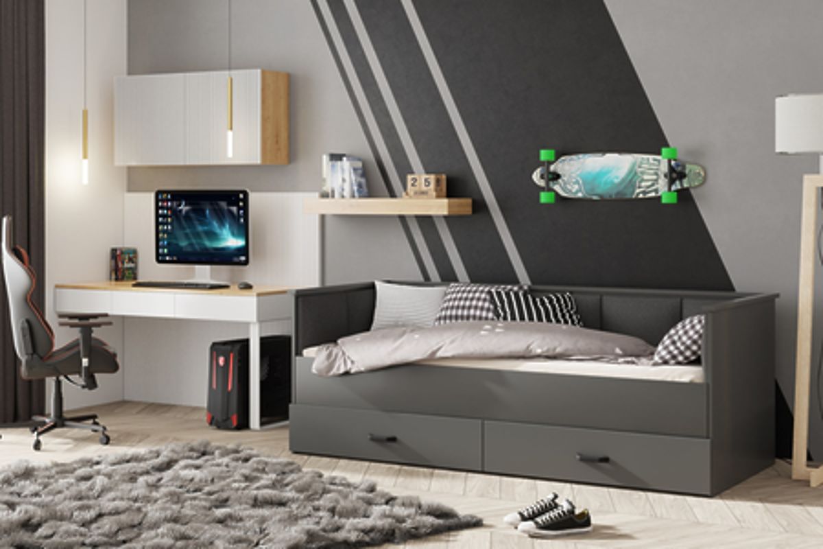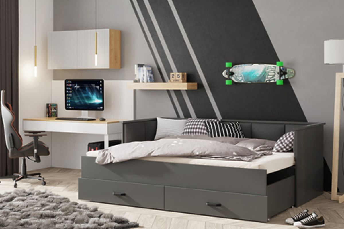 Le design minimaliste du lit HELIOS, enrichi de panneaux rembourrés en velours de haute qualité, confère à l'intérieur un caractère moderne et élégant. Les panneaux ne sont pas seulement un complément esthétique, mais aussi un élément pratique qui offre un soutien confortable pour la lecture, le visionnage de la télévision ou l'étude. Le matériau doux et agréable au toucher apporte chaleur et convivialité, soulignant le caractère accueillant de la chambre des jeunes. De plus, le lit est équipé de deux tiroirs spacieux sur glissières à billes, permettant de ranger le linge de lit, les vêtements ou d'autres petits objets. Cette solution aide non seulement à maintenir l'ordre, mais optimise également l'utilisation de l'espace, ce qui est particulièrement important dans les petites chambres.
