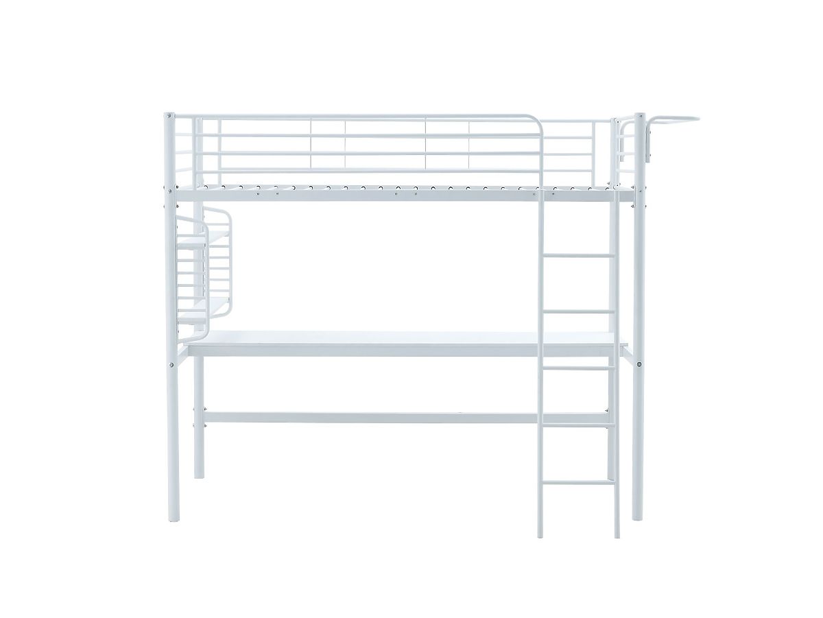 Lit mezzanine blanc avec bureau et organisateur intégré. .. plus