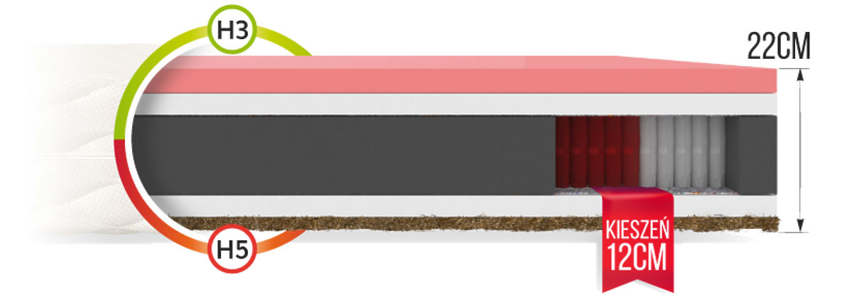 Les ressorts sont fabriqués avec la technologie NanoHard , qui garantit la solidité et prolonge la durée de vie. La deuxième couche est en mousse pure durable et flexible, qui offre un bon amorti corporel et un soutien de la colonne vertébrale de haute qualité. Votre corps s'adaptera parfaitement au matelas et vous vous réveillerez reposé et rafraîchi le matin. De plus, la mousse thermoplastique VISCO assure un confort et une commodité inégalés grâce à sa mémoire de forme. Il cartographie parfaitement le corps et revient ensuite à son état d'origine. Pour assurer une respirabilité supplémentaire, un insert en noix de coco a été utilisé, qui, en tant que matériau naturel, renforce légèrement l'ensemble de la structure. Un matériau séparateur a été inséré entre les ressorts et la mousse. Il s’agit d’un feutre naturel qui peut prolonger considérablement la durée de vie du matelas et renforcer sa construction.