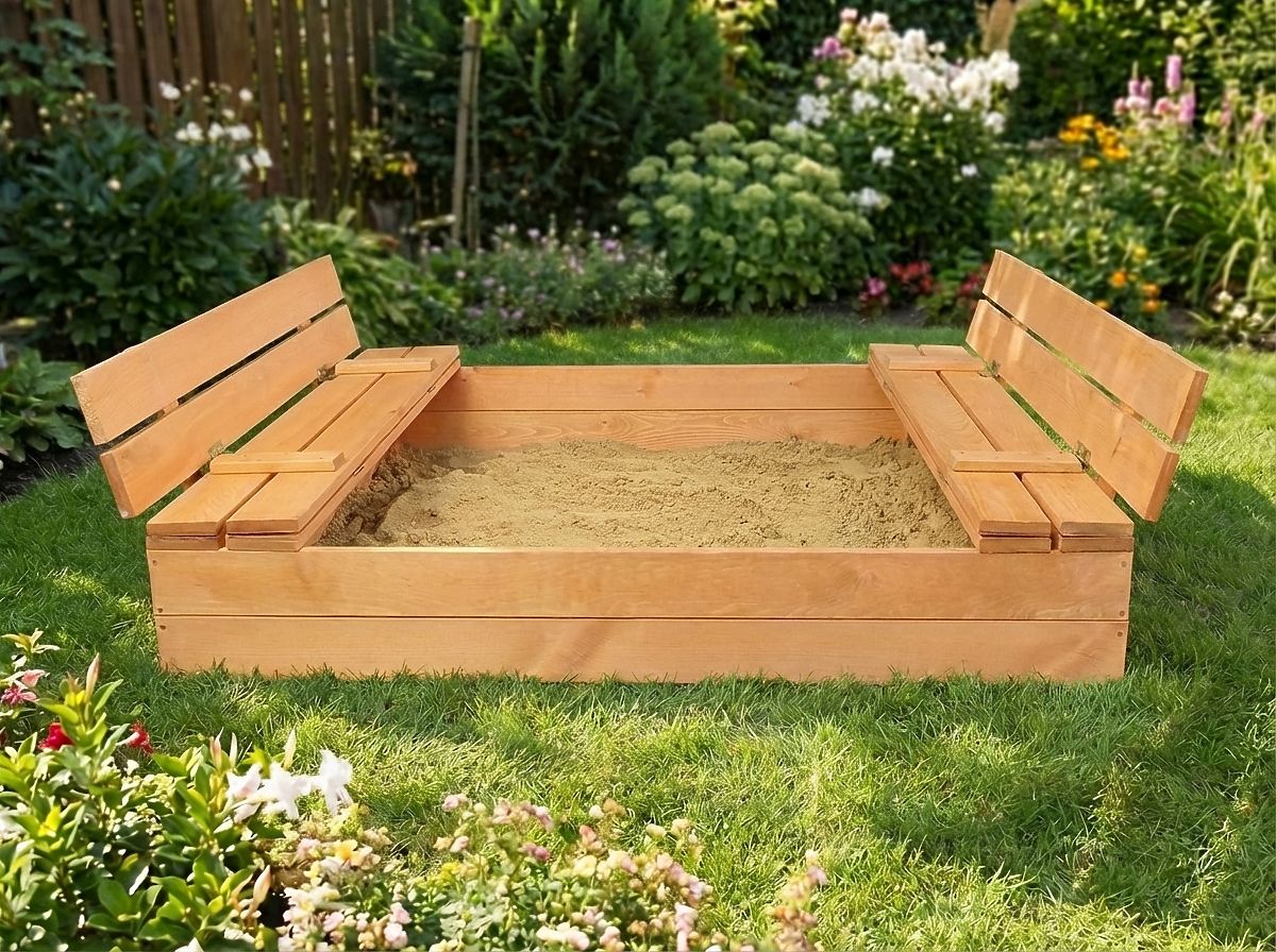 Bac à sable en bois avec système de fermeture et bancs intégrés. .. plus