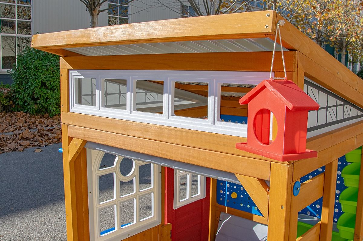 Maison de jeu en bois avec toit incliné et nombreux éléments pratiques. .. plus