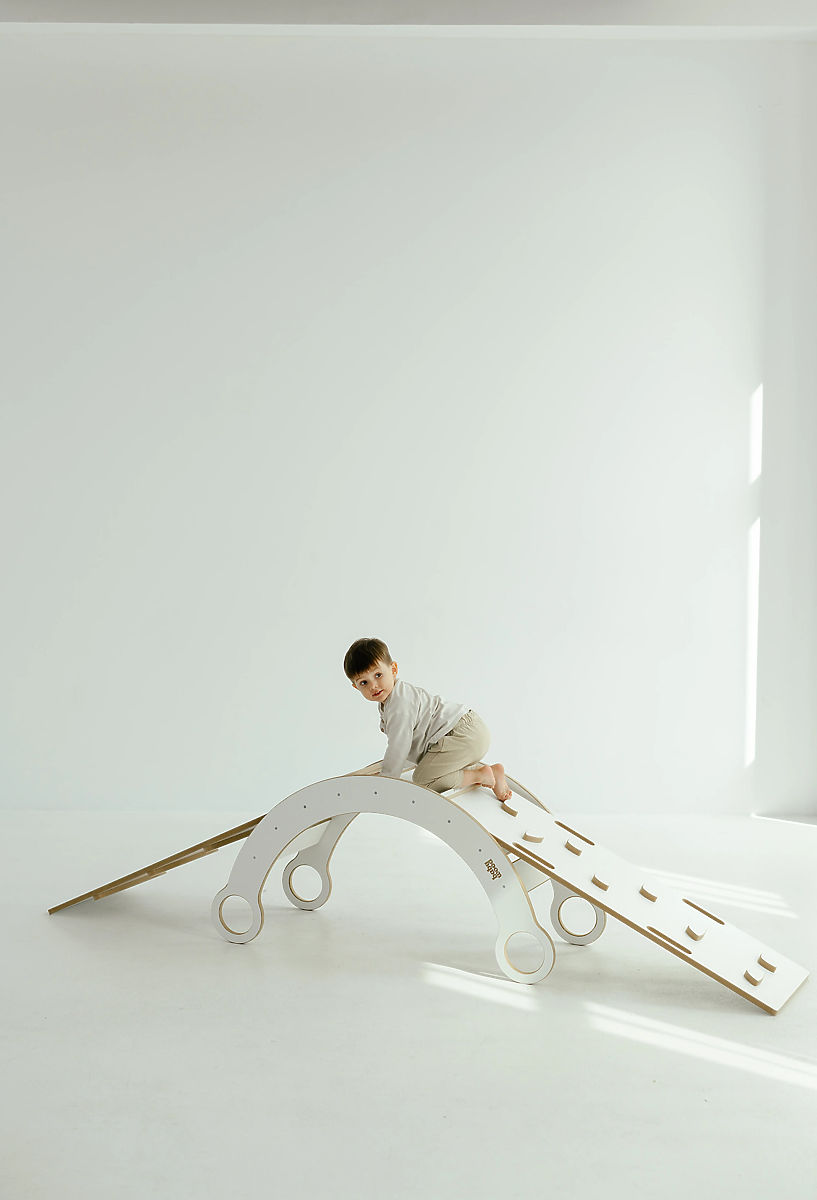 Grâce aux planches supplémentaires, l'ensemble offre encore plus de variantes de jeu. Un côté de la planche est lisse et sert de toboggan, l'autre est équipé de barreaux ou de pierres d'escalade qui motivent les enfants à grimper et à découvrir de nouvelles compétences motrices.