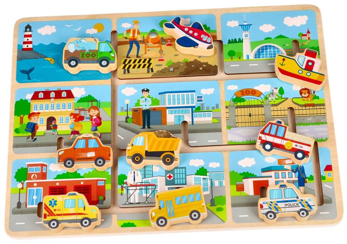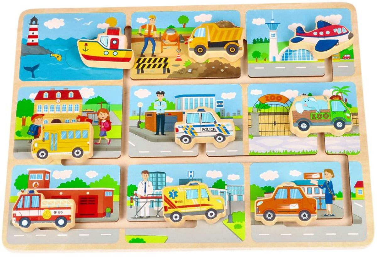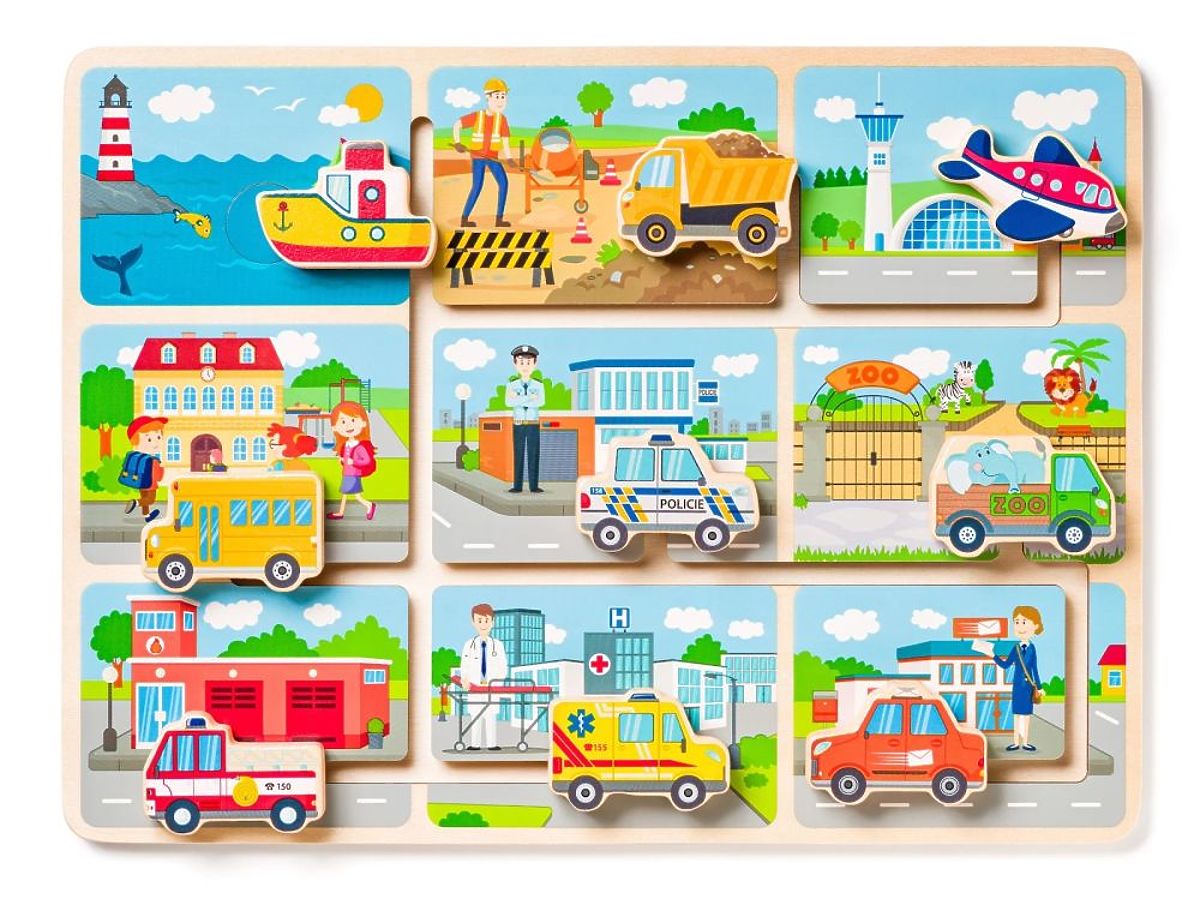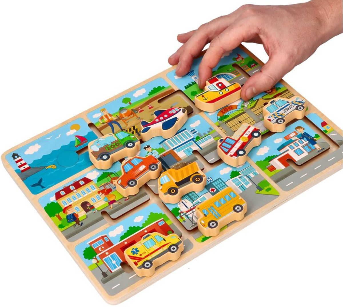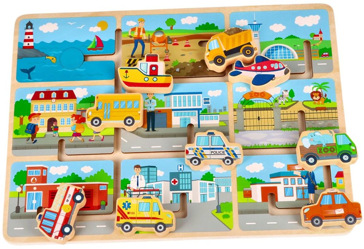 Le puzzle est fabriqué en bois. Sur la base en bois, il y a un labyrinthe et 9 véhicules qu'il faut garer sous le bâtiment correspondant. Vous y trouverez par exemple : un bateau, un avion, un camion ou une ambulance.