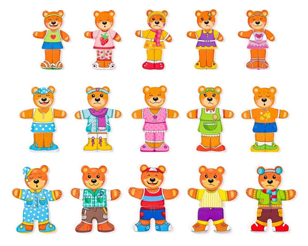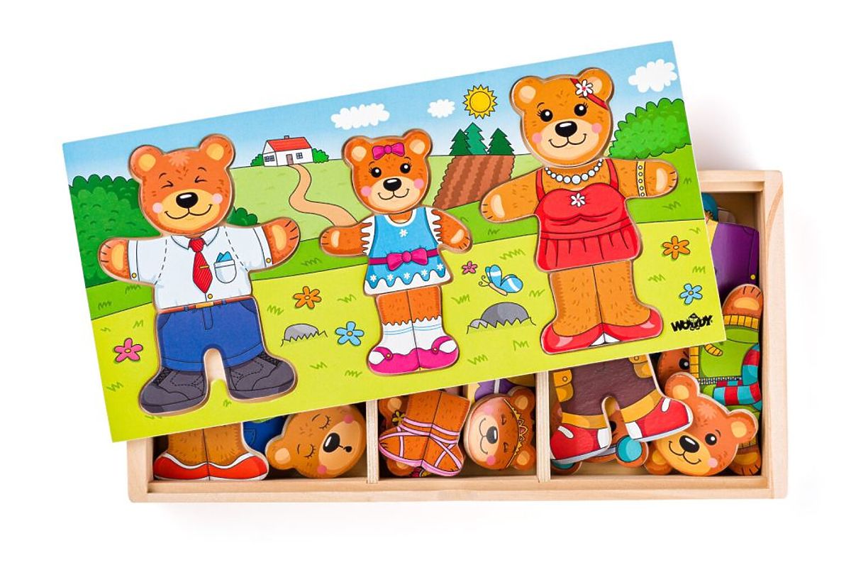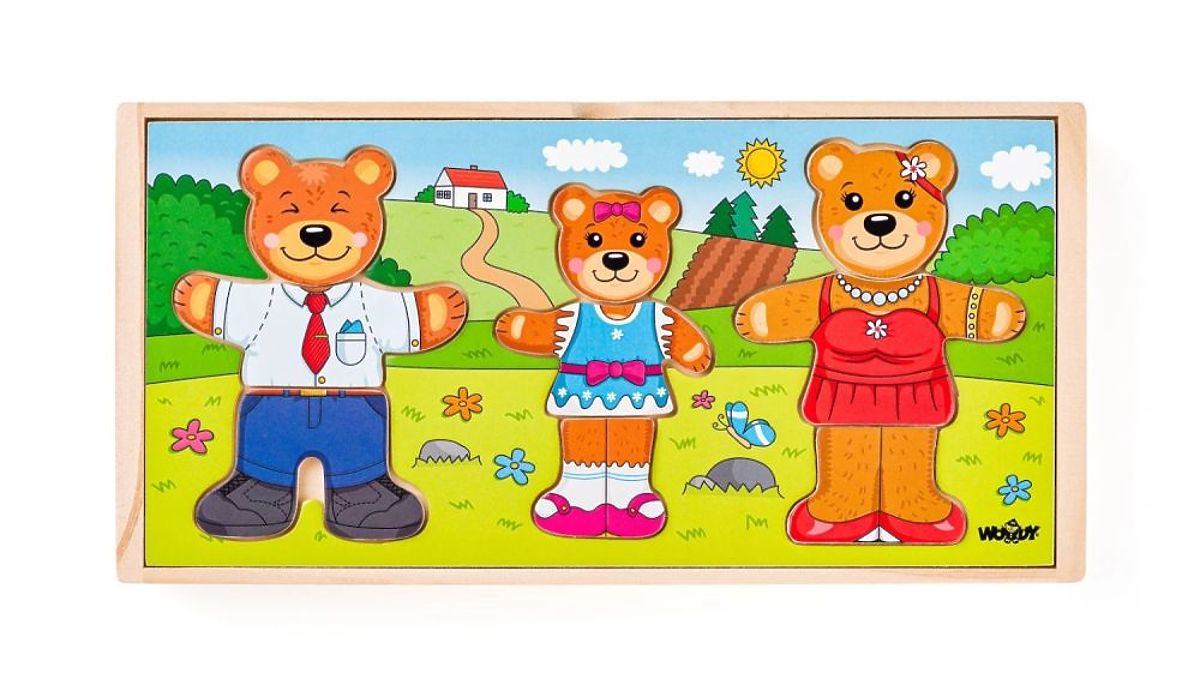 Le puzzle en bois "Habille la famille d'ours" est un excellent exercice pour développer les compétences manuelles de l'enfant et son imagination. Dans ce puzzle, il faut choisir les différentes parties de l'ours : la tête, le torse et les jambes, de manière à ce que les vêtements correspondent par exemple au temps, à l'humeur ou à ce que l'ours va faire. Grâce au fait que chaque tête a une expression différente, l'enfant peut également apprendre à reconnaître et nommer les émotions, ce qui est une bonne leçon d'empathie. Pourquoi quelqu'un peut-il être triste, en colère ou effrayé et que faire dans une telle situation ?