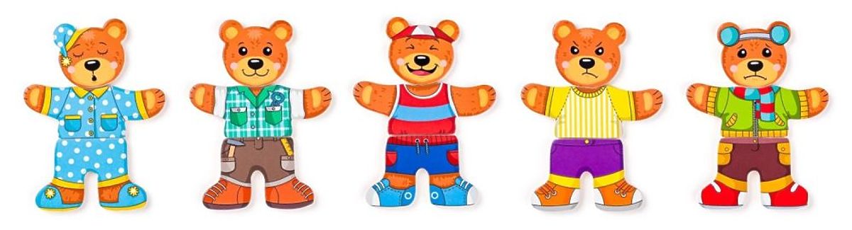 L'enfant peut choisir librement les vêtements pour l'ours. Pendant le jeu, l'enfant apprend à reconnaître les parties du corps et les vêtements.
