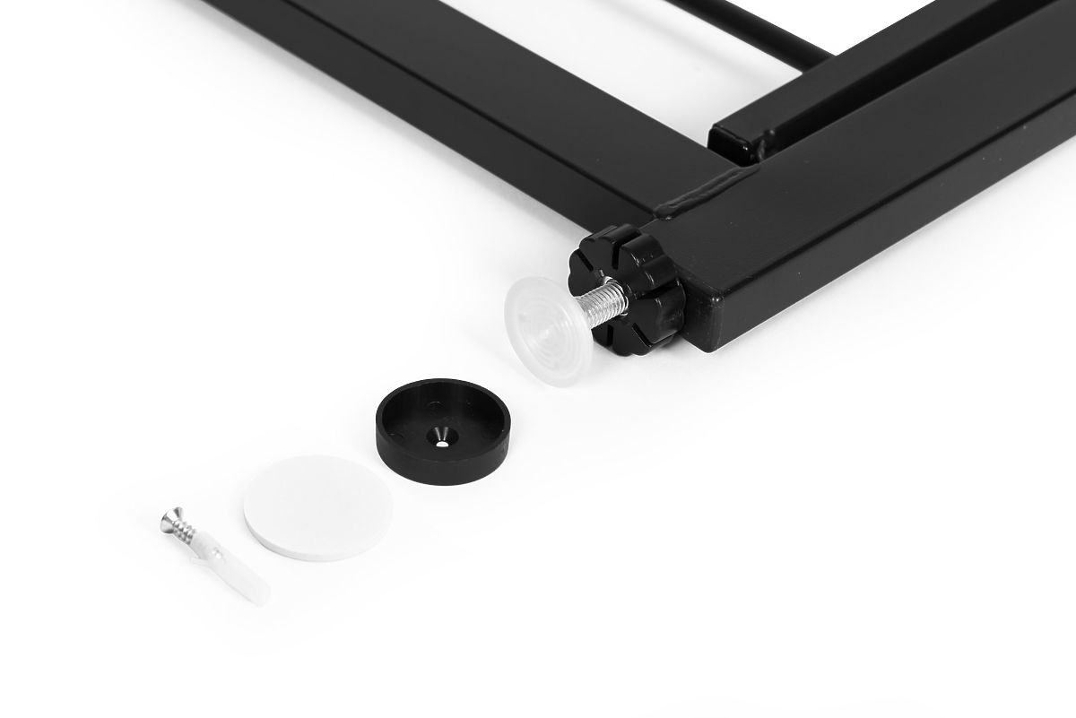 Cependant, si vous estimez que le lieu d'installation nécessite une fixation permanente, vous pouvez utiliser les patins profilés spéciaux avec un petit trou au centre inclus. En les fixant au mur (les vis sont incluses dans le paquet) à l'endroit prévu, vous pouvez y insérer des vis qui fixeront la barrière selon le principe de l'expansion de toute la structure.